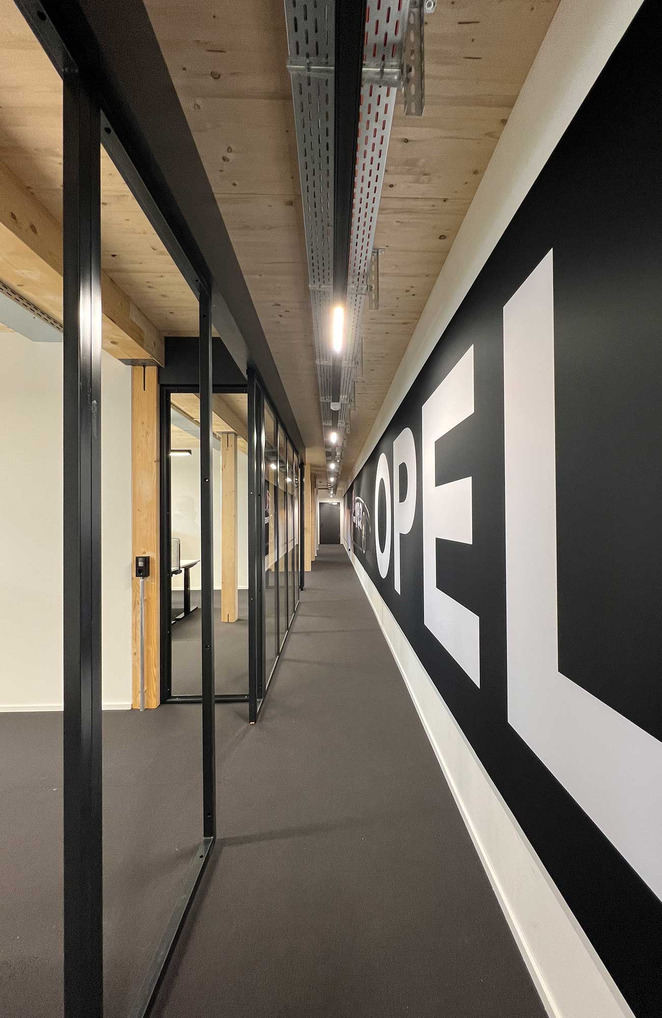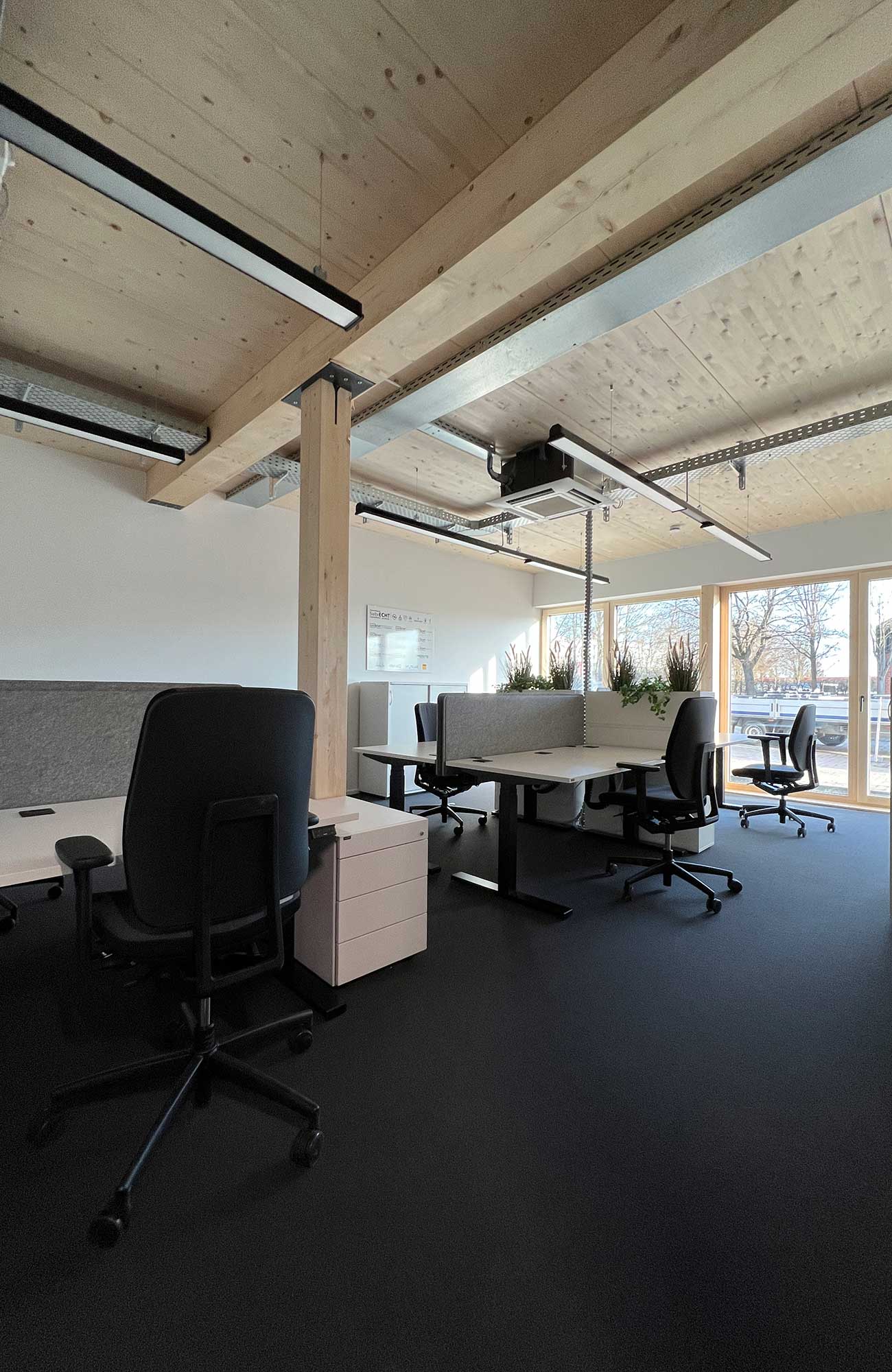 Nach nur drei Monaten Bauzeit wurde das dreigeschossige Bürogebäude in Betrieb genommen. Der Holzbau ergänzt den Komplex und soll in Zukunft den Empfang und die Verwaltung beherbergen.
