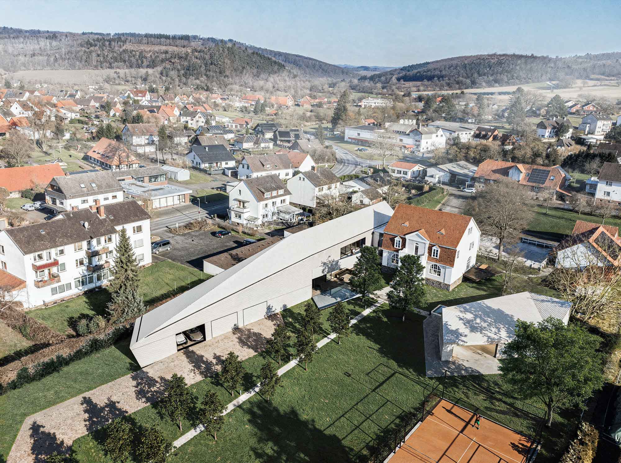 Ein Aufzug ermöglicht die barrierefreie Erschließung des Bestands und macht das gesamte Ensemble zukunftsfähig für mehrere Generationen. Die zentrale Zufahrt mündet in den Innenhof, der von den Gebäuden umschlossen ist. Dabei wurden die gewachsenen Strukturen des Grundstücks respektiert – Bestandsbäume wurden in die Planung integriert.