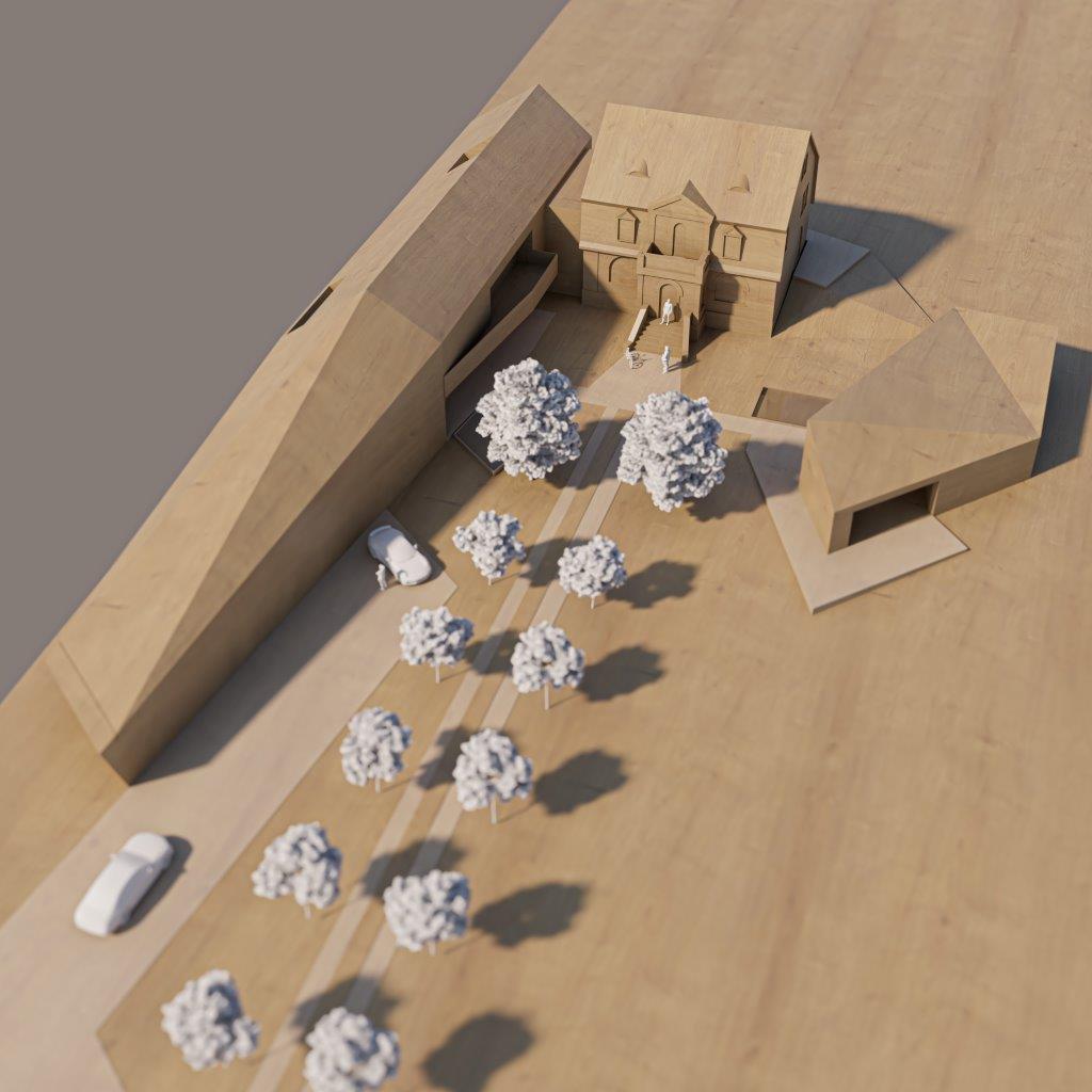 Auf einem großzügigen Grundstück entsteht ein barrierefreier Erweiterungsbau an ein bestehendes Wohnhaus. Die Architektur kombiniert moderne Formensprache mit polygonalen Dachflächen und setzt sich bewusst vom wertvollen historischen Bestand ab.