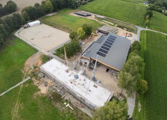 Die Bauarbeiten am Reittherapiezentrum schreiten planmäßig voran. Aus der Vogelperspektive lässt sich der Gesamtumfang des Projekts gut erkennen. Mit dem Baustart des Reitstalls mit Ferienwohnungen wurde nun das letzte Gebäudeteil begonnen.