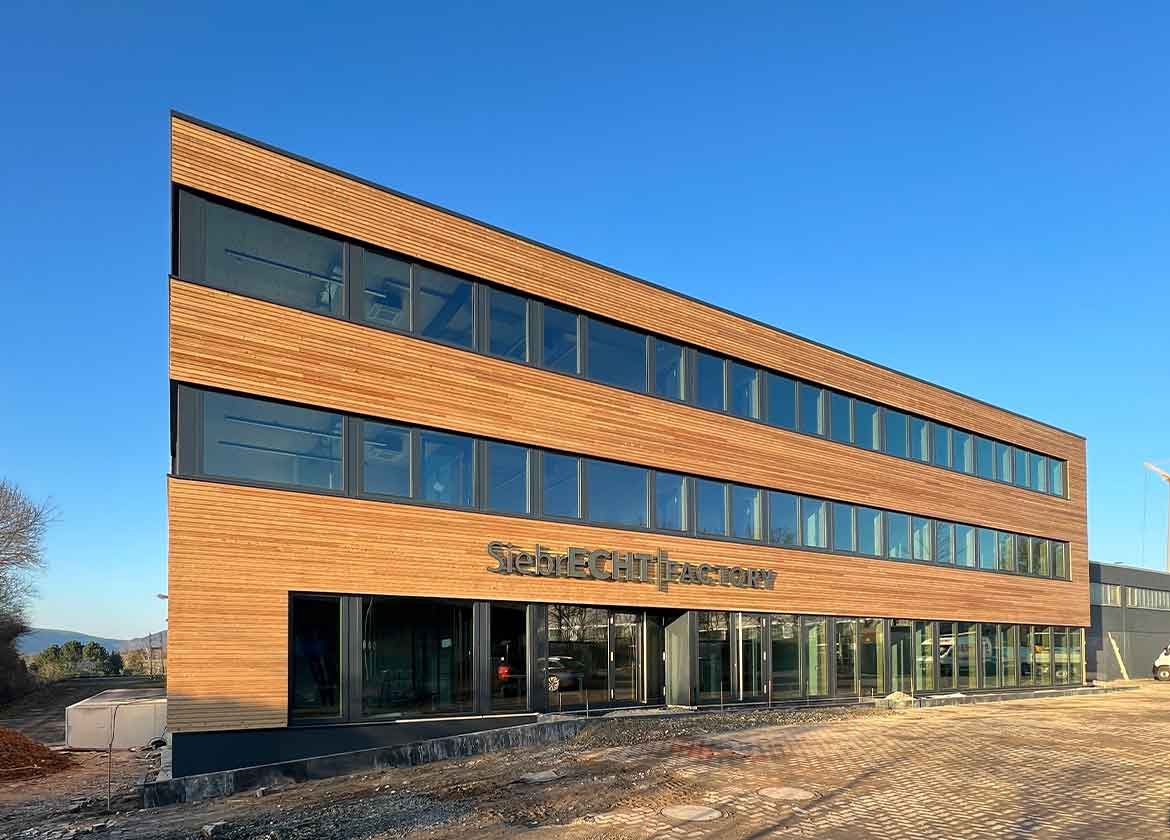 Nach nur drei Monaten Bauzeit wurde das dreigeschossige Bürogebäude in Betrieb genommen. Der Holzbau ergänzt den Komplex und soll in Zukunft den Empfang und die Verwaltung beherbergen.