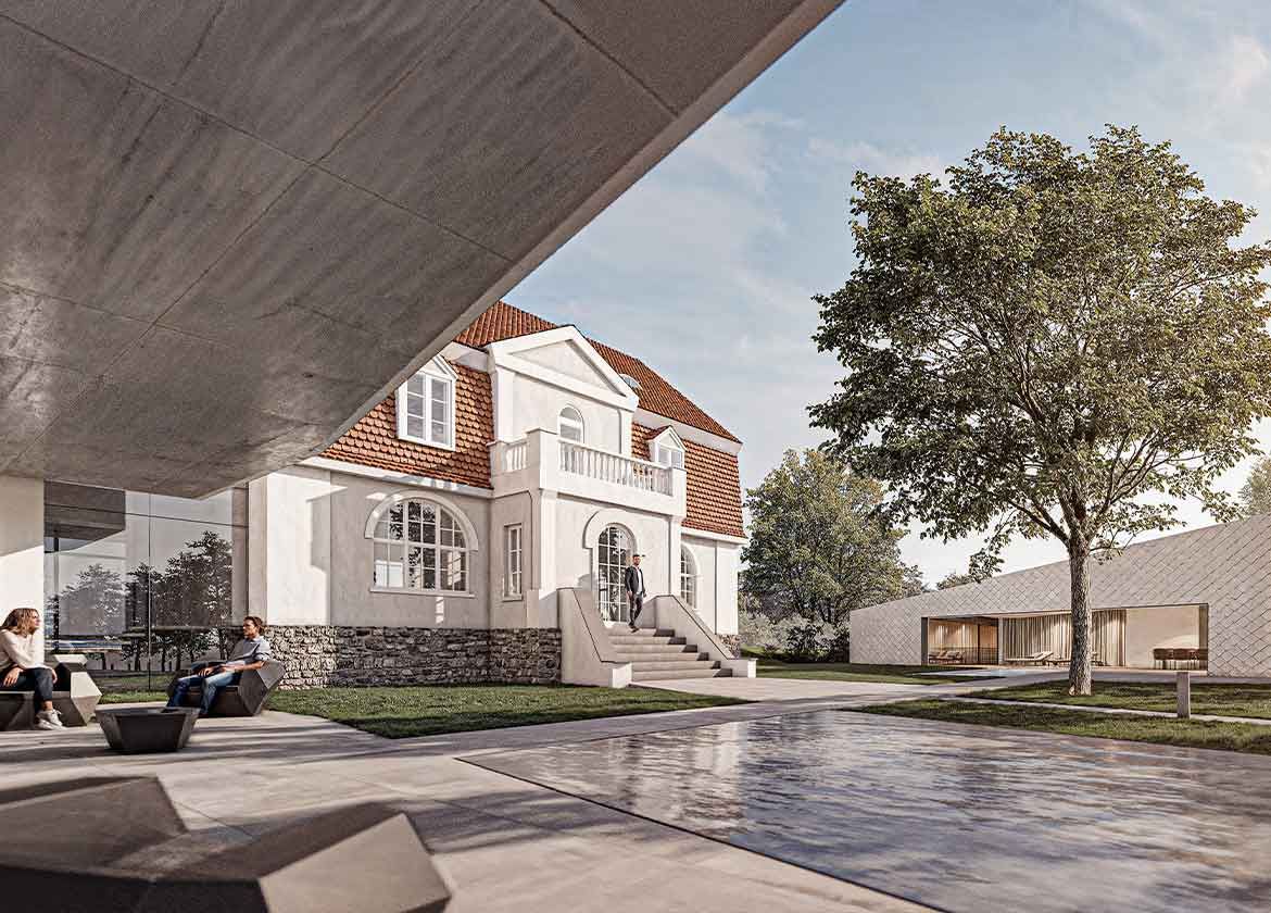 Entwurf des barrierefreien Erweiterungsbau "HBII". In Kombination mit einem Pool- und Freizeitgebäude entsteht ein einzigartiges Wohnensemble, das sich um einen großzügigen Innenhof gruppiert. Große Glasflächen und eine klare Architektursprache setzen einen bewussten Kontrast zum historischen Bestand. Der Entwurf von K17 Architekten BDA verbindet zeitgemäßes Wohnen mit Nachhaltigkeit und hoher Lebensqualität.
