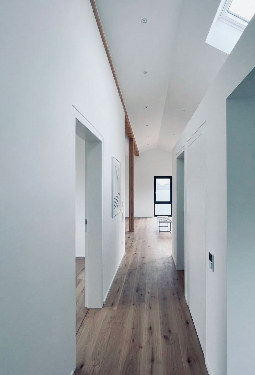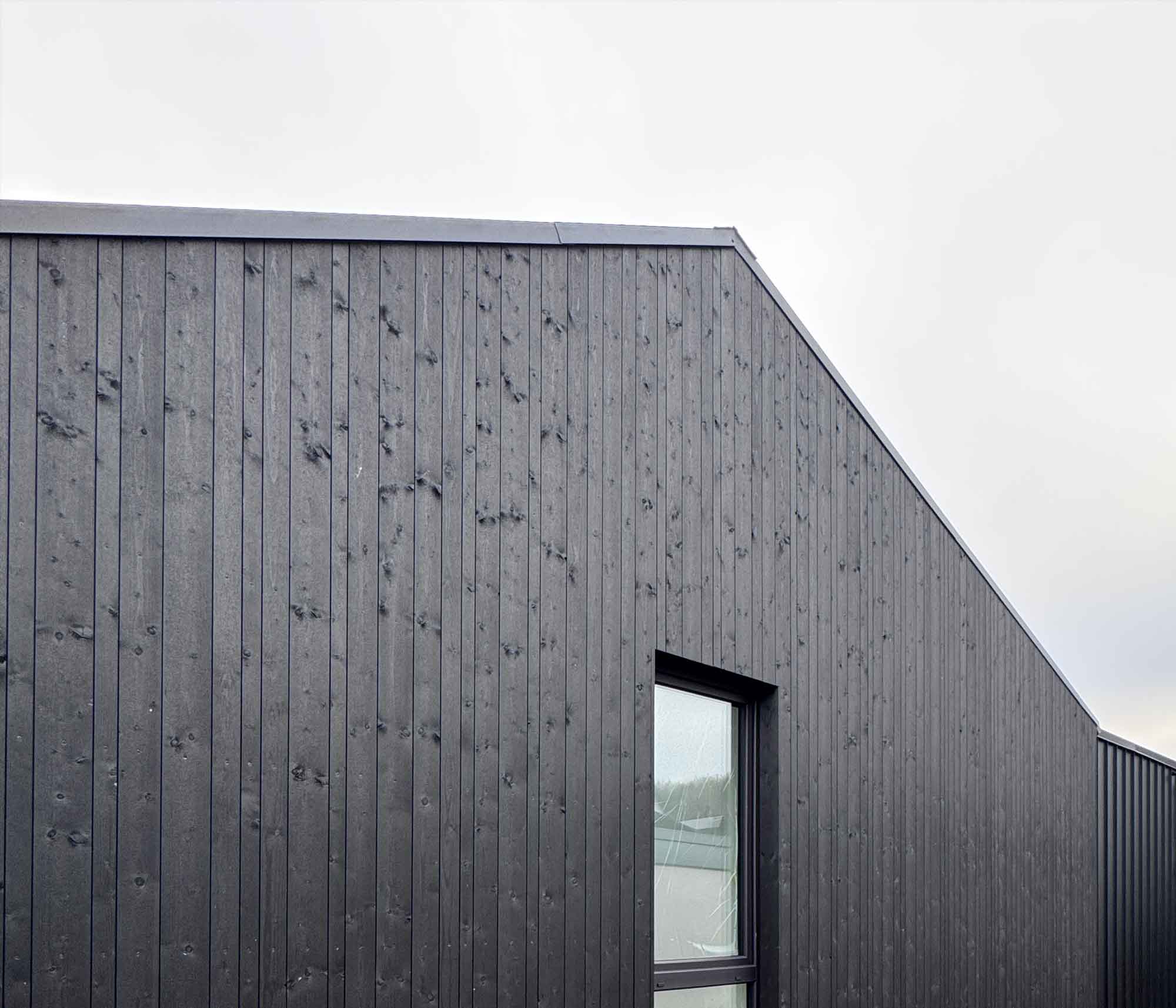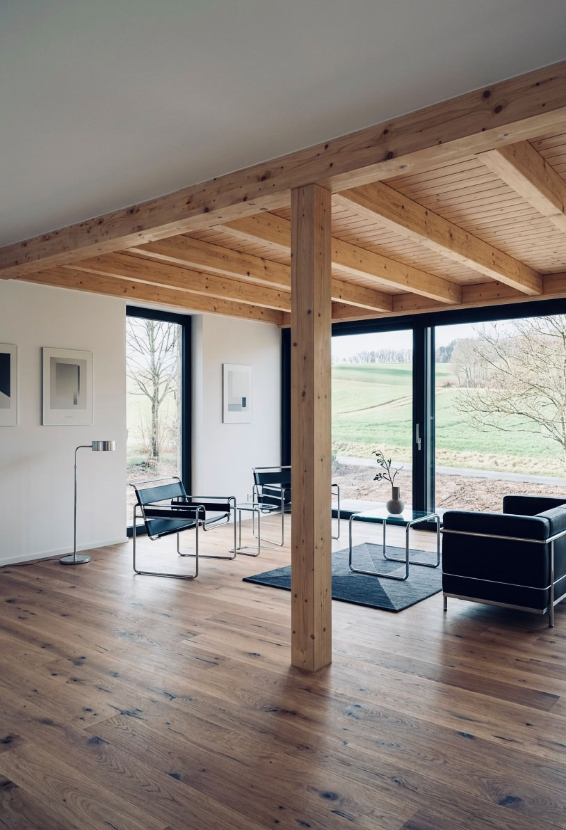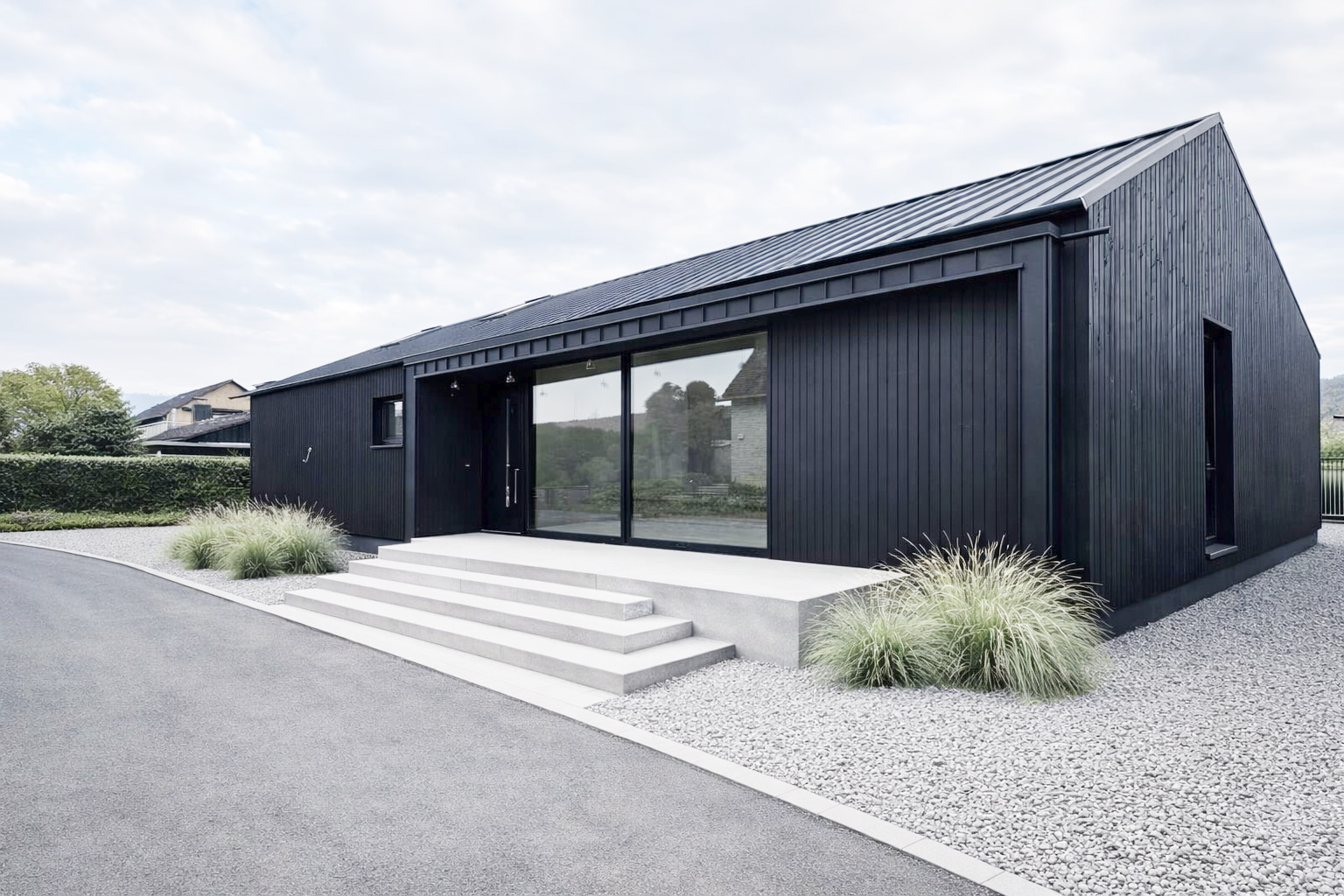 Die Bauherren wünschten sich ein Gebäude, das sowohl gestalterisch als auch ökologisch überzeugt. In enger Zusammenarbeit entstand ein filigraner Bau mit dunkler, lasierter Holzfassade, die dem Haus eine klare und zugleich zurückhaltende Präsenz verleiht. Innen dominieren helle, offene Räume mit natürlicher Materialität – sichtbare Holzoberflächen, viel Tageslicht und ein harmonisches Zusammenspiel von Funktion und Atmosphäre.