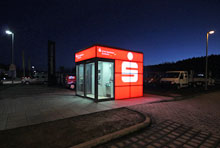 Dezember 2014 ... Der Glaskörper mit Geldausgabeautomaten sowie einem Überweisungsterminal entstand an der am stärksten frequentierten Kreisstraße. Der SB-Pavillon wurde im Werk vorgefertigt und innerhalb kurzer Zeit vor Ort in Betrieb genommen. Sobald die Dämmerung eintritt leuchtet die Glasfassade signalrot. Die Außenanlagen sind barrierefrei.