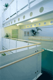 Das dreigeschossige, offene Foyer bildet das Herzstück der Anlage und verbindet auf elegante Weise die Gemeinschaftsbereiche – darunter auch ein großzügiger Speisesaal mit angeschlossenem Café.
