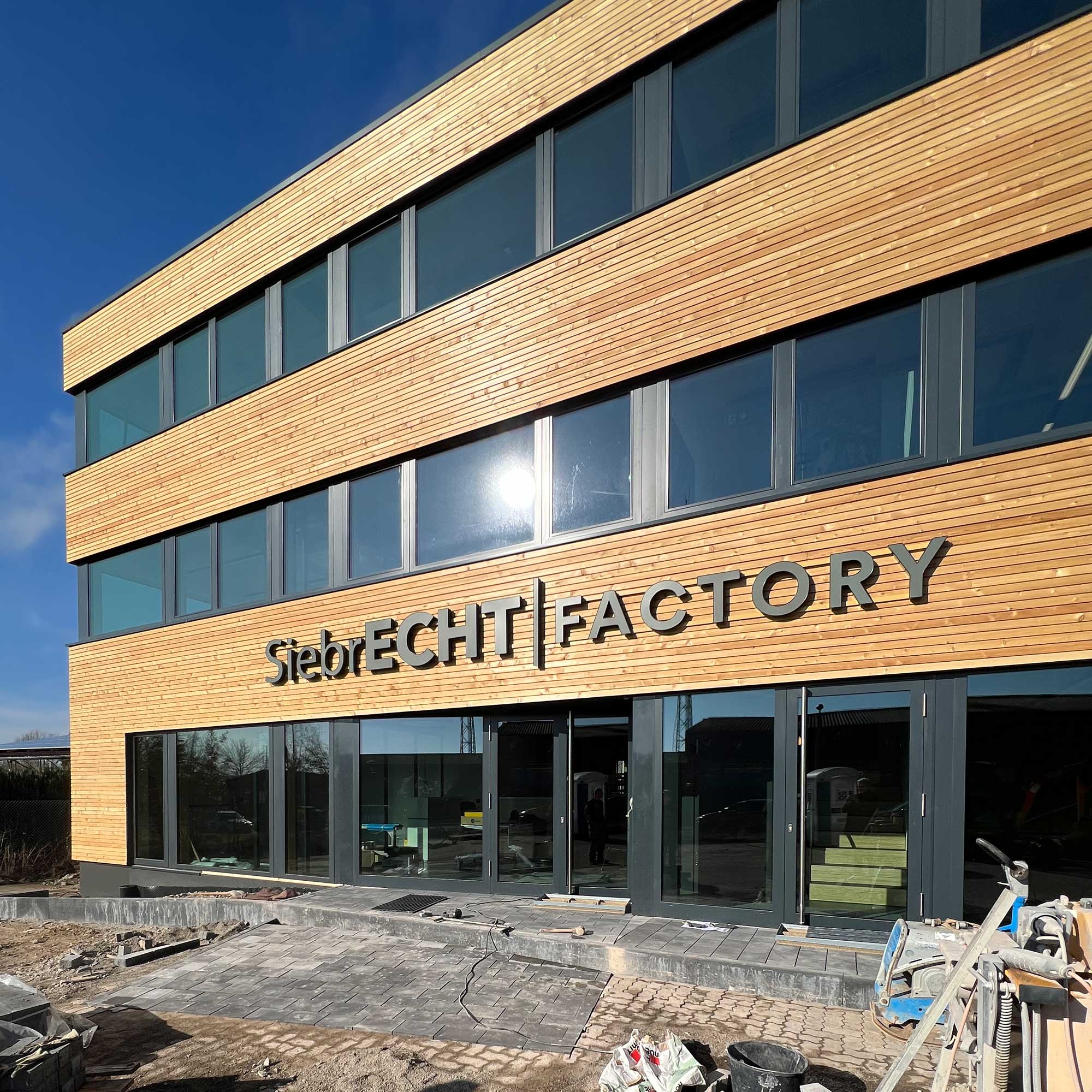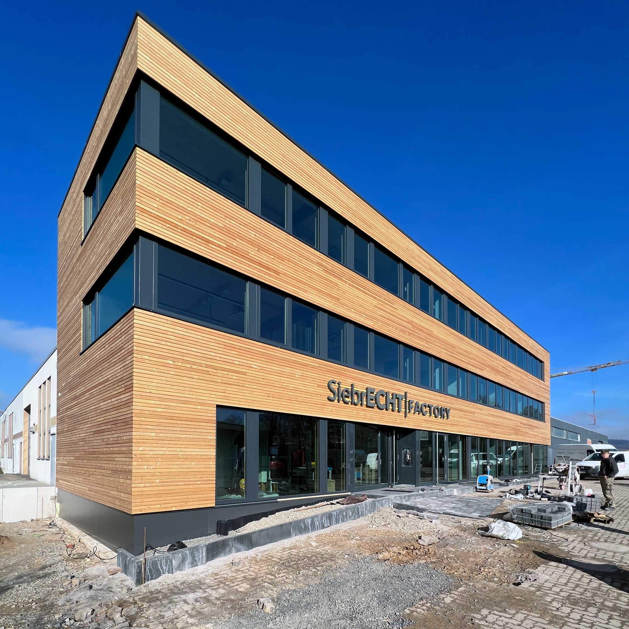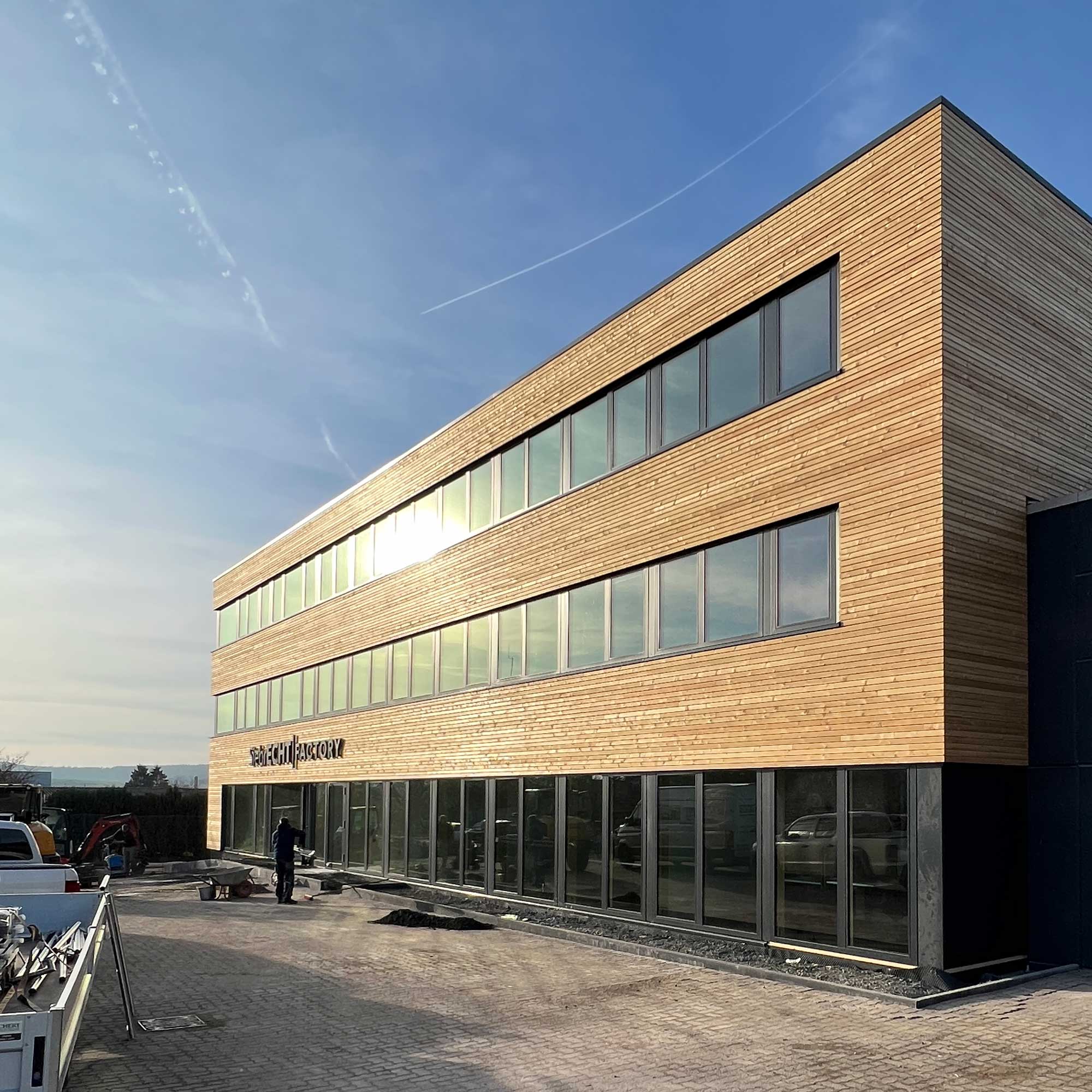 Nach nur drei Monaten Bauzeit wurde das dreigeschossige Bürogebäude in Betrieb genommen. Der Holzbau ergänzt den Komplex und soll in Zukunft den Empfang und die Verwaltung beherbergen.