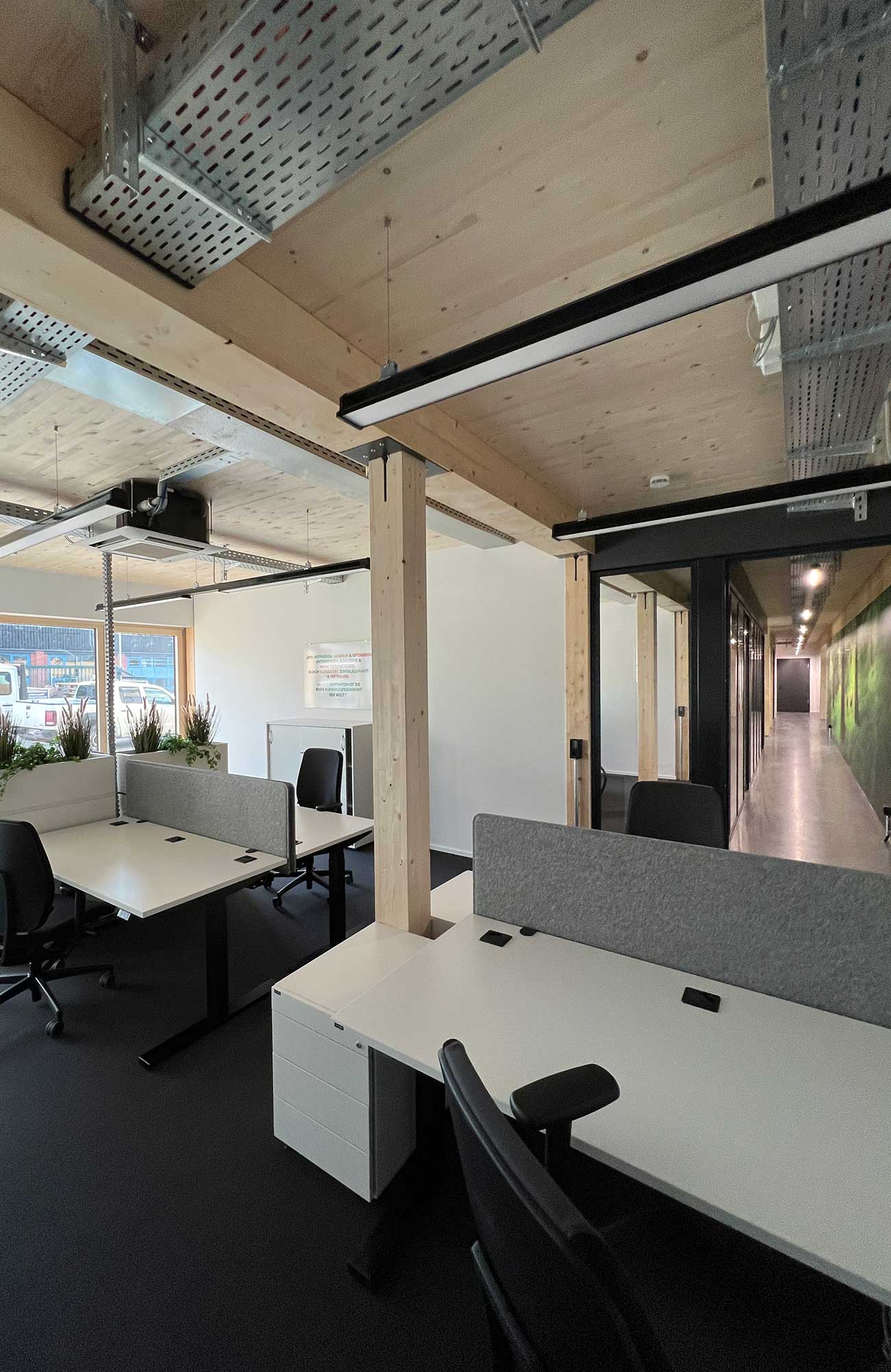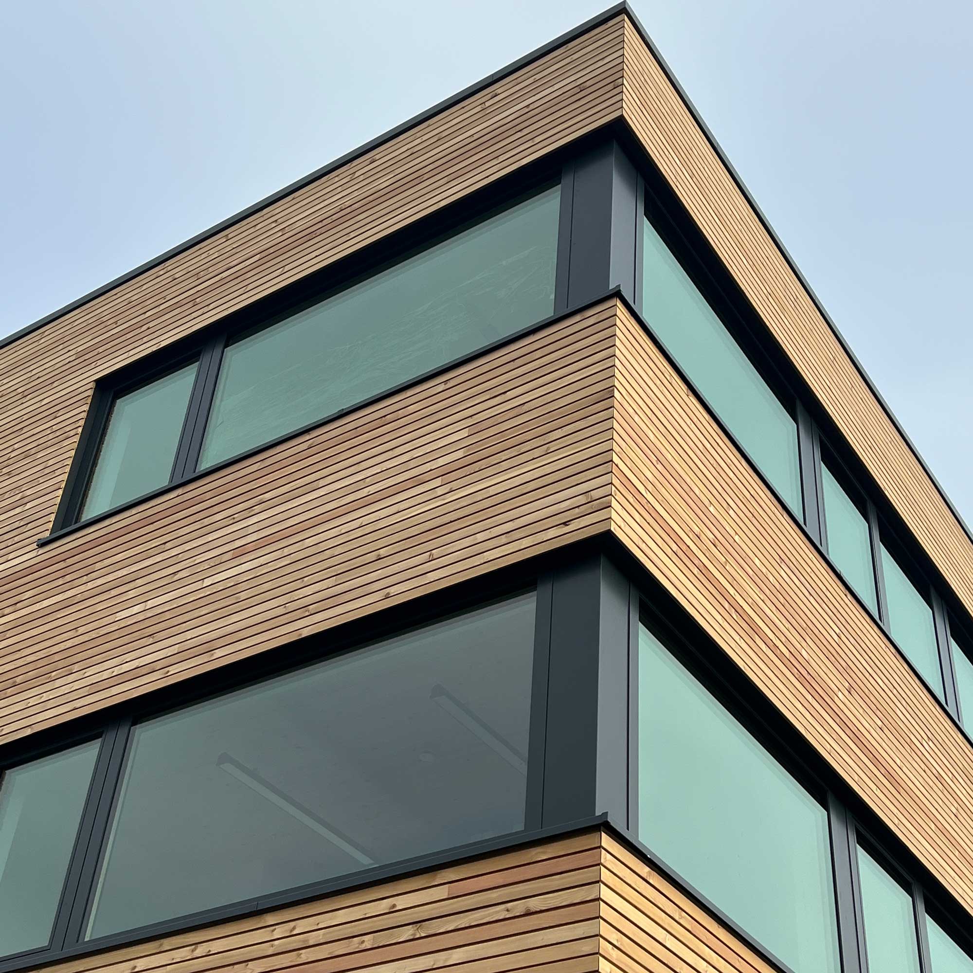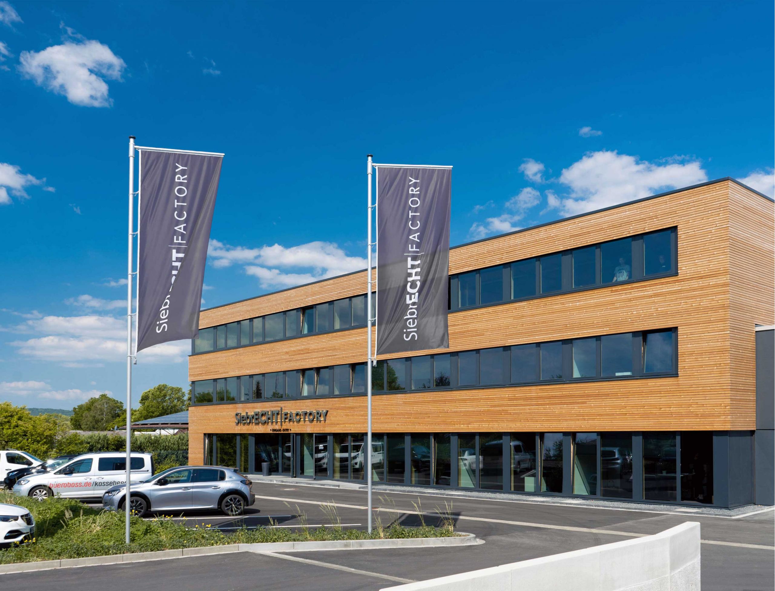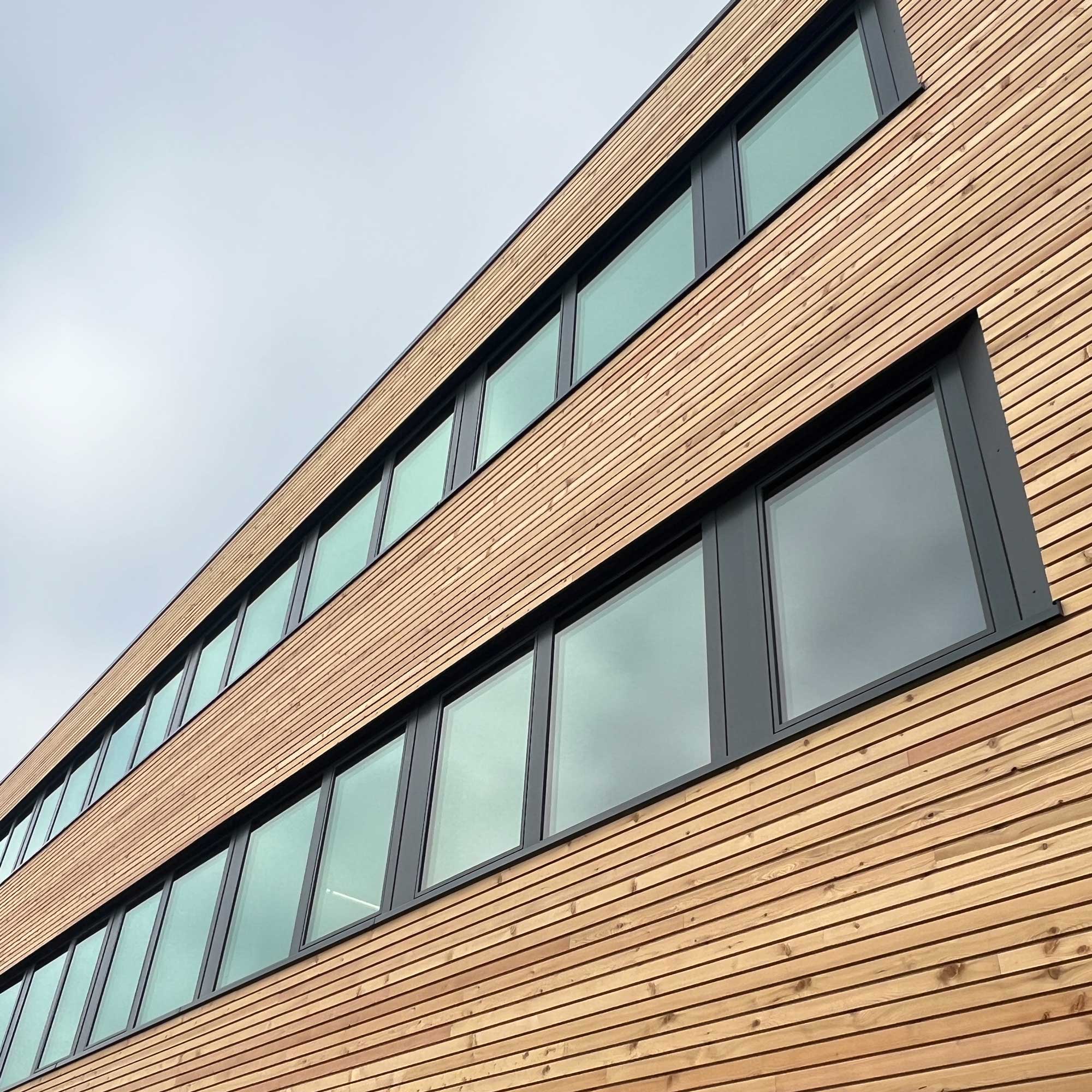 Nach nur drei Monaten Bauzeit wurde das dreigeschossige Bürogebäude in Betrieb genommen. Der Holzbau ergänzt den Komplex und soll in Zukunft den Empfang und die Verwaltung beherbergen.