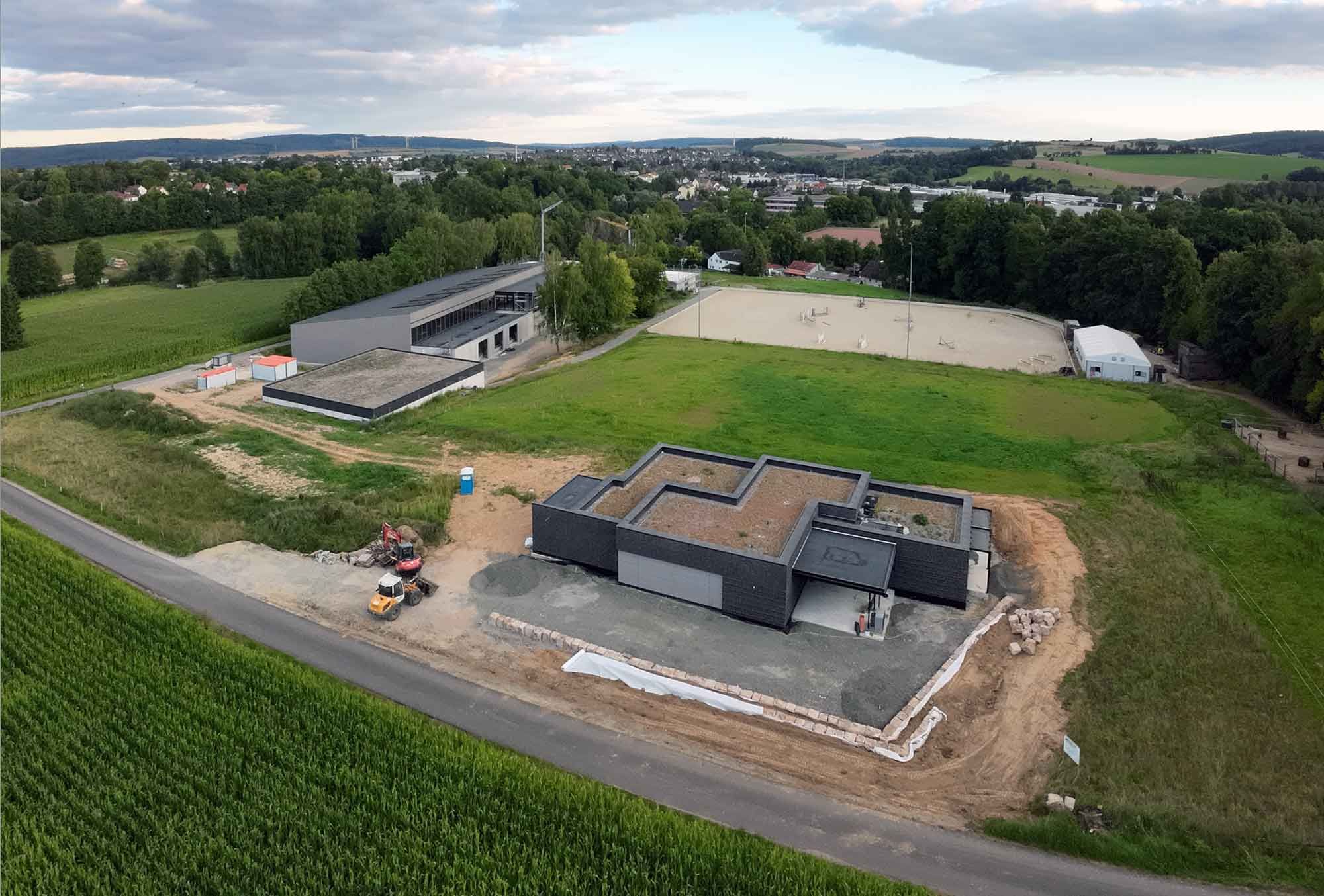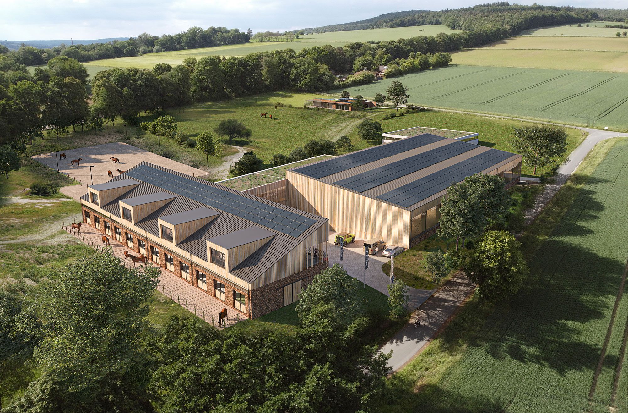 K17 Architekten BDA präsentieren den Entwurf eines Reittherapiezentrums mit integrierten Ferienwohnungen. Die Architektur zeichnet sich durch einen modernen Stil aus, der sich harmonisch in die umgebende Natur einfügt. In Abstimmung mit dem Bauherren wurde ein starker Fokus auf Nachhaltigkeit, sowohl in Bezug auf die Bauweise als auch auf den Betrieb gelegt.