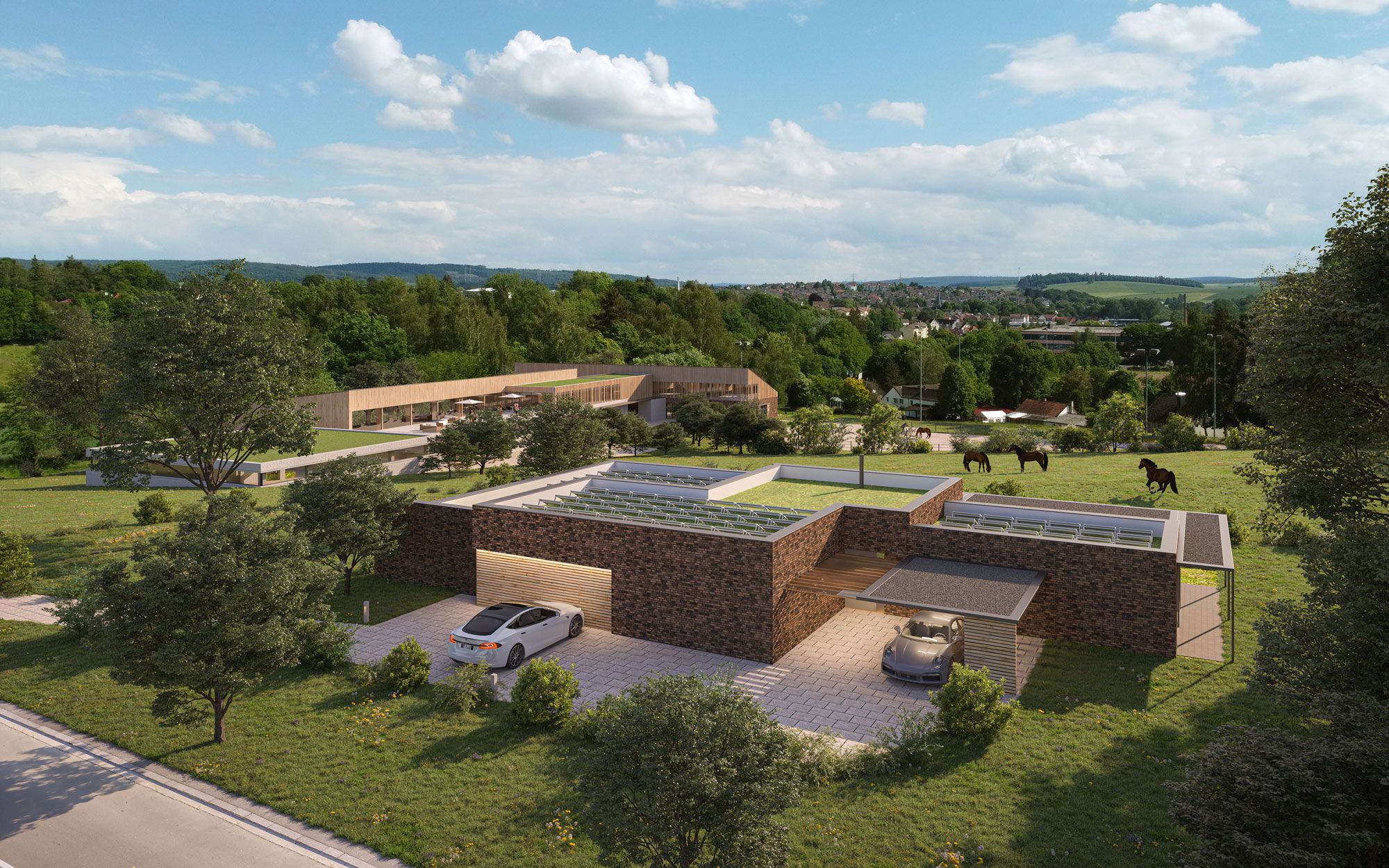 Der Entwurf für das Reittherapiezentrum mit Ferienwohnungen vereint somit moderne Architektur, Nachhaltigkeit und den Einsatz neuester Technologien, um eine inspirierende und umweltfreundliche Einrichtung zu schaffen.