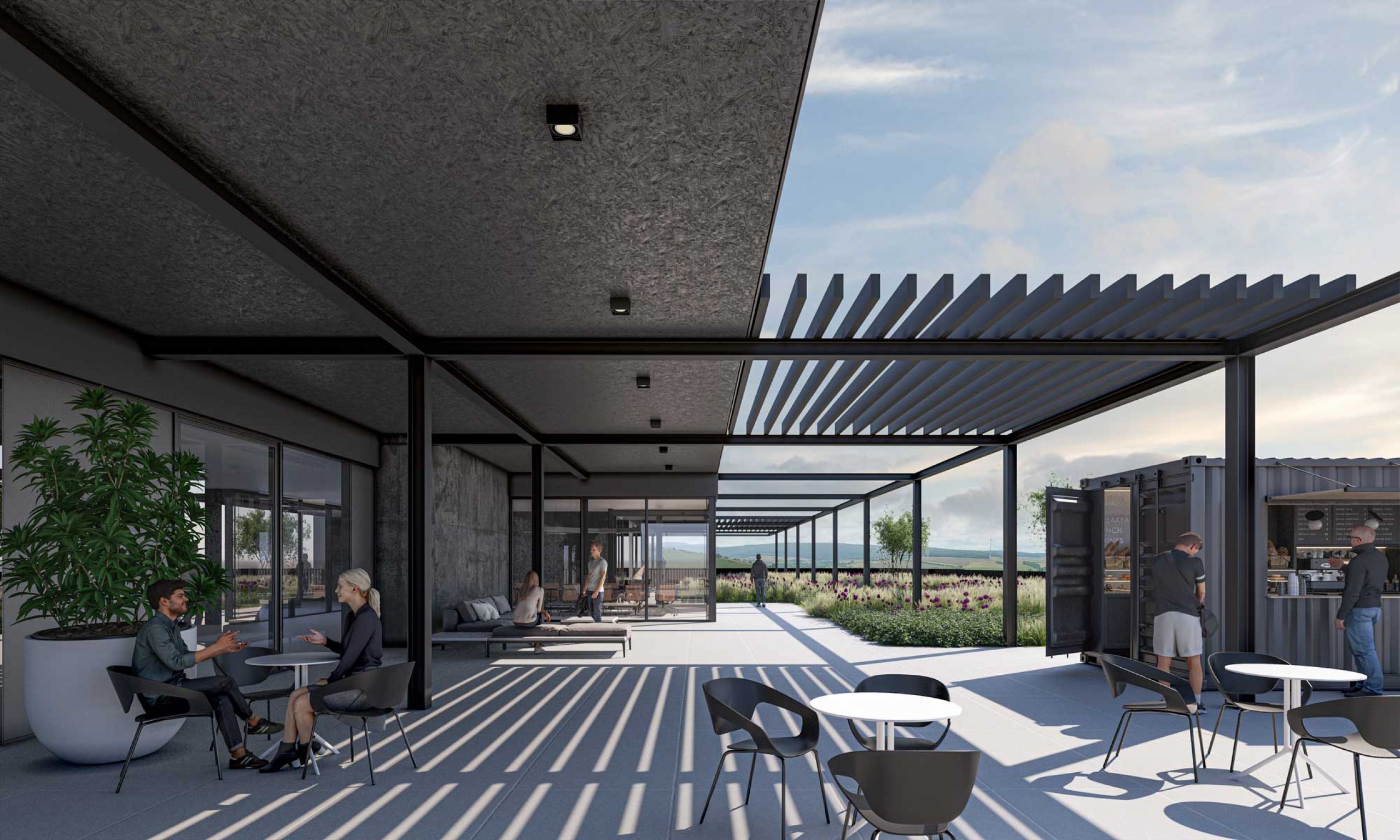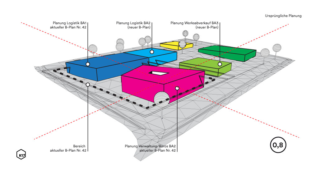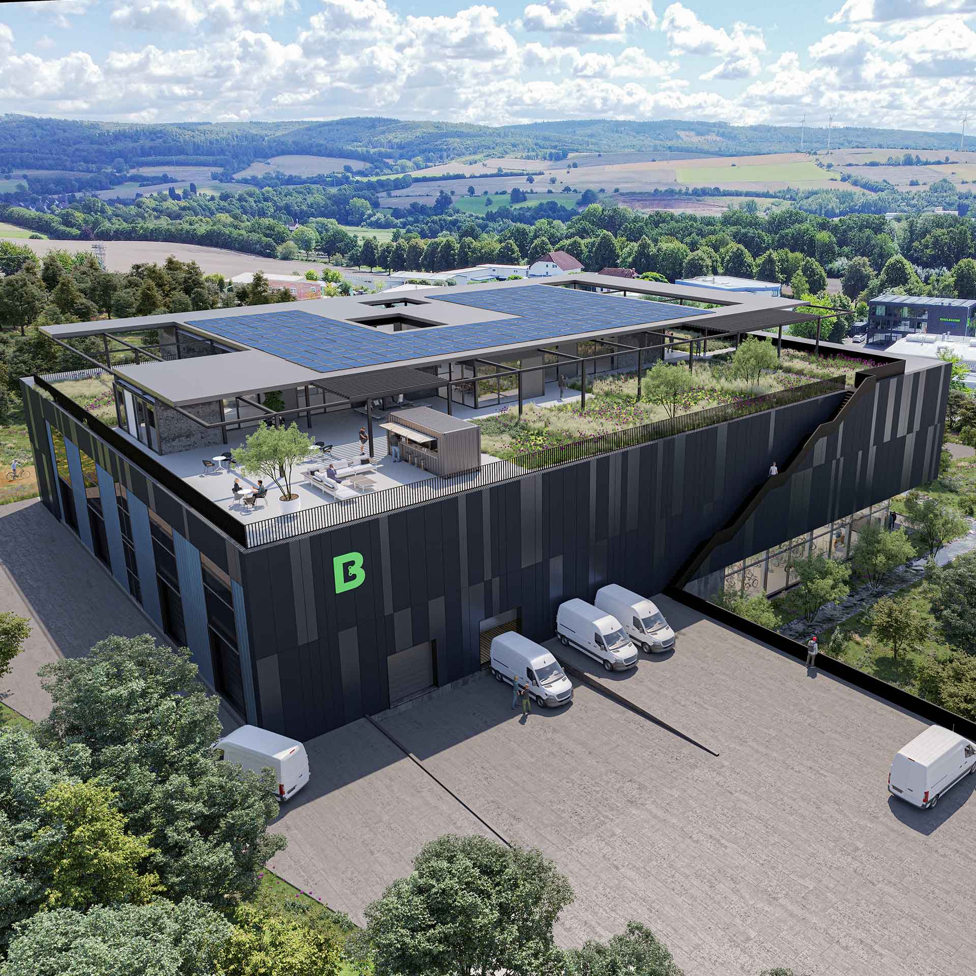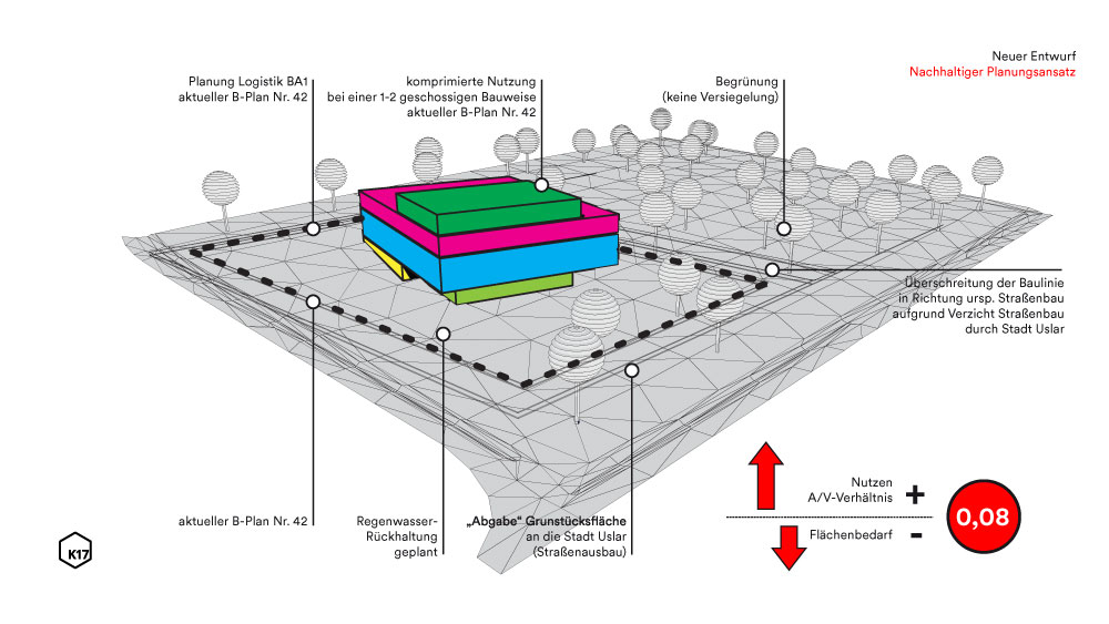 K17 Architekten BDA haben in enger Absprache mit dem Bauherren einen Entwurf für ein Industrie- und Gewerbegebäude mit Logistikhalle, Verkaufsraum, Tiefgarage, Werkstätten sowie Büro- und Verwaltungsflächen auf dem Dach entwickelt. Anstatt mehrere Gebäude zu errichten und damit eine hohe Flächenversiegelung zu verursachen, wurden die verschiedenen Nutzungen geschickt übereinander geplant. Dies führte zu einer großen Grundstücksfläche, die nun begrünt und ökologisch wertvoll gestaltet werden soll.