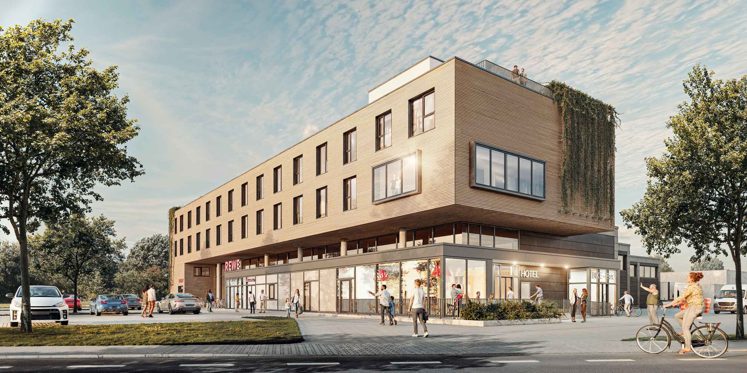 K17 Architekten BDA hat als Projektsteuerungsteam die Planung eines Verbrauchermarktes mit ausgegliedertem Hotel an markanter innerstädtischer Lage begleitet. Das Gebäudeensemble kombiniert Funktionalität mit ökologischer Nachhaltigkeit. Der zeitgemäße Markt deckt den täglichen Bedarf von Anwohnern und Besuchern, während das Hotel moderne Zimmer und ein Selbst-Check-in-System für maximale Flexibilität bietet. Fahrradfahrer profitieren von einer Bike-Station, und das Ensemble wird durch eine Bäckerei mit Café ergänzt, die Synergien für das Hotel schafft. Begrünte Fassaden und Dächer sowie eine markante Holzfassade runden das nachhaltige Design ab.