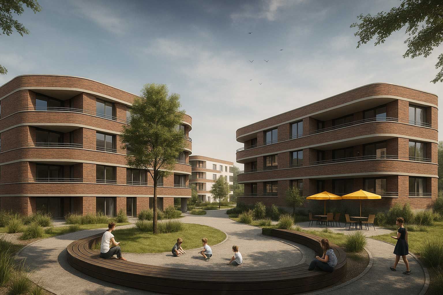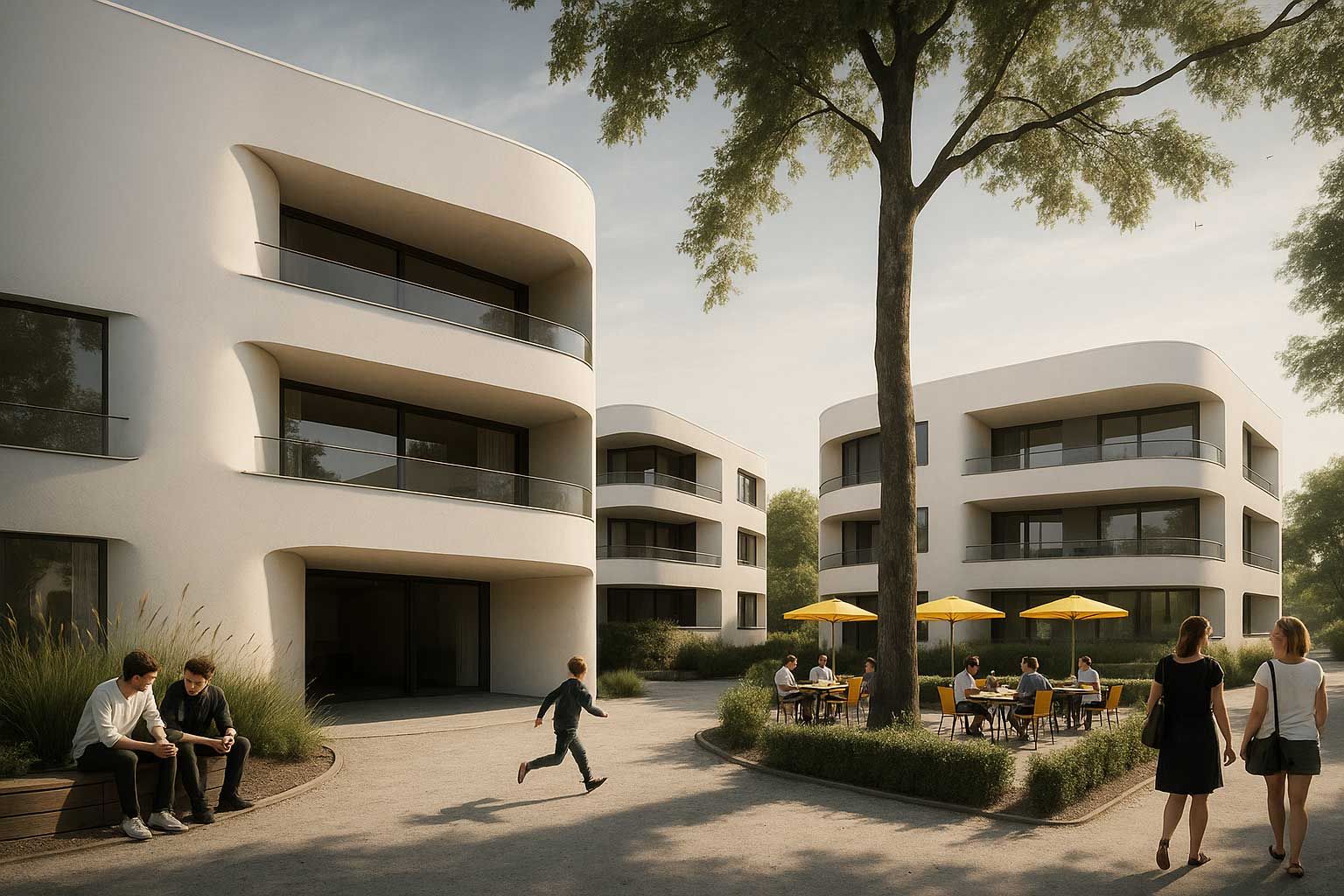 Aus den baurechtlichen Rahmenbedingungen ergeben sich klare, funktionale Gebäudestrukturen. Das städtebauliche Konzept sieht differenzierte Baukörper mit zwei bis drei Geschossen vor, die sich selbstverständlich in das bestehende Umfeld einfügen. Im Zentrum der Anlage entsteht ein hochwertig gestalteter, begrünter Innenhof, der nicht nur die Aufenthaltsqualität steigert, sondern dem Ensemble auch eine identitätsstiftende Mitte verleiht.