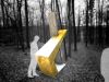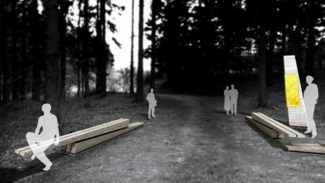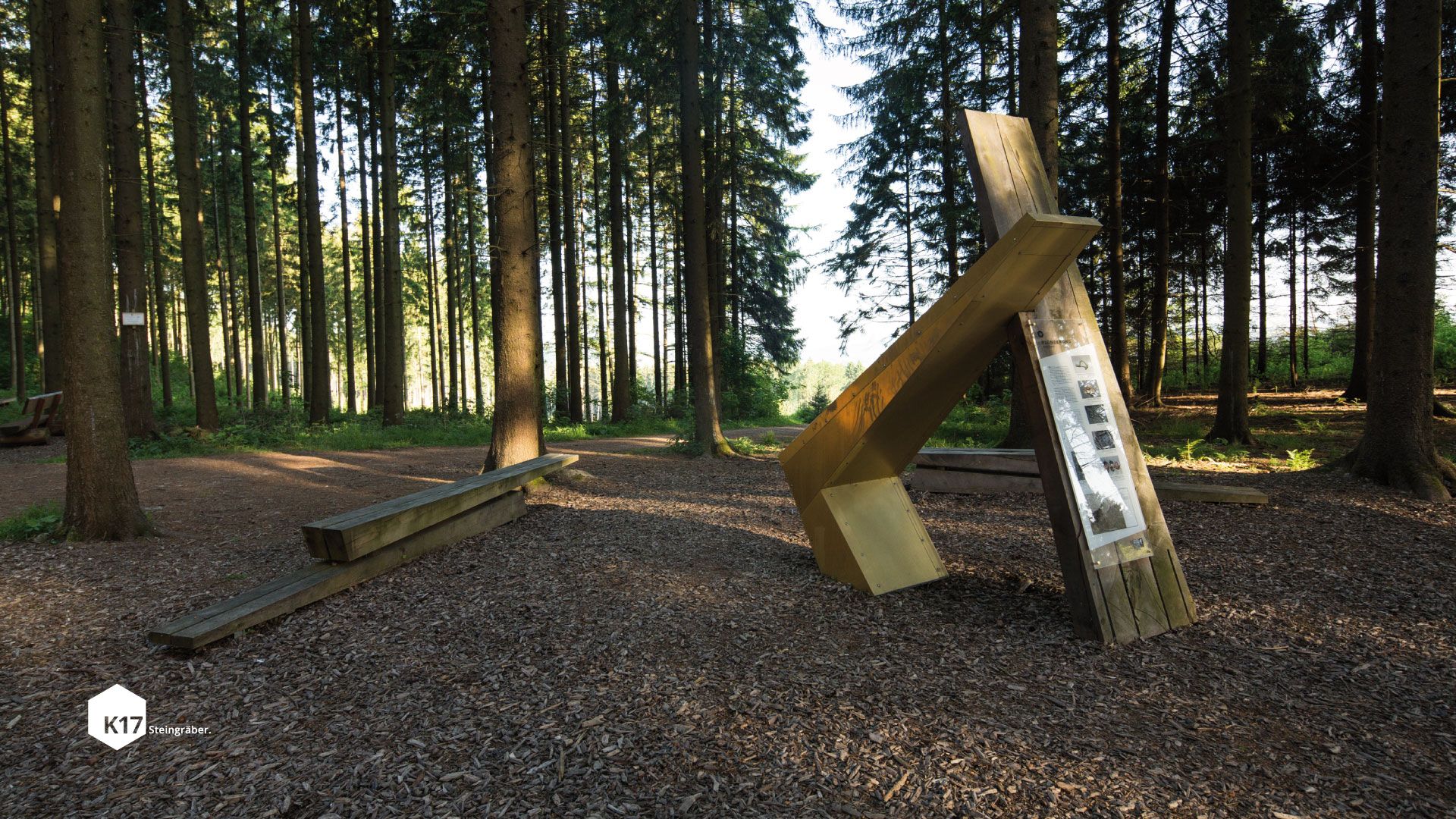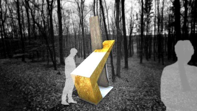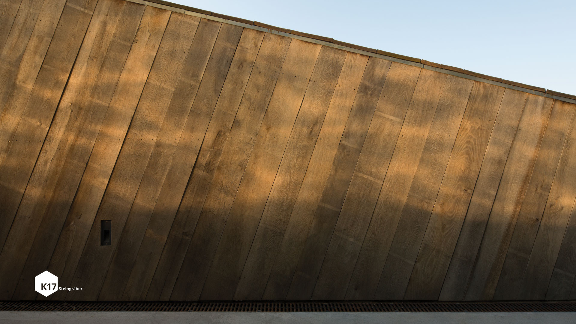 Der Entwurf besticht durch eine klare, kraftvolle Formensprache. Zwei skulpturale Wandscheiben – scheinbar „aus dem Erdreich gestoßen“ – prägen das Bild. Die Kombination aus rustikalem Eichen-Vollholz und goldfarbenem Metall symbolisiert die Gegensätze der Schlacht zwischen Germanen und Römern und verweist auf die historische Brisanz des Ortes.