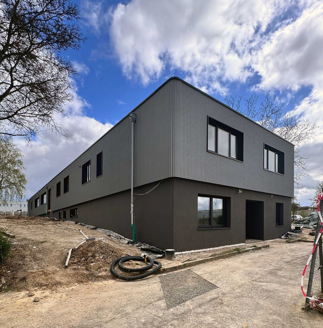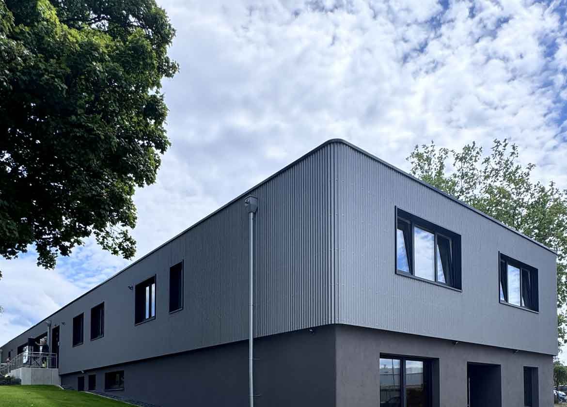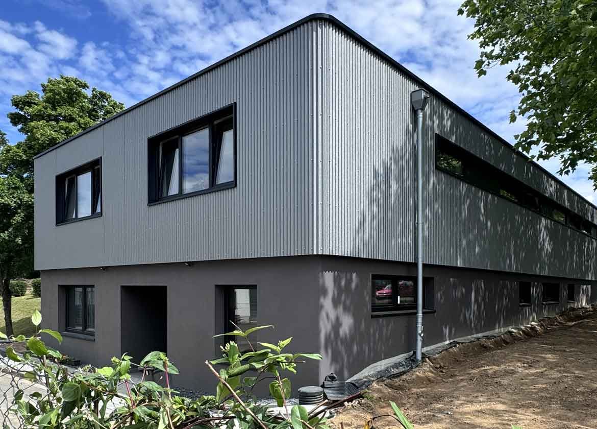 Die äußere Gestaltung des Gebäudes wird durch eine moderne Blechfassade geprägt, die nicht nur langlebig ist, sondern auch eine zeitgemäße Optik verleiht. Durch die Verwendung von hochwertigen Materialien wird nicht nur die Langlebigkeit des Gebäudes gewährleistet, sondern auch seine ästhetische Qualität langfristig gesichert.