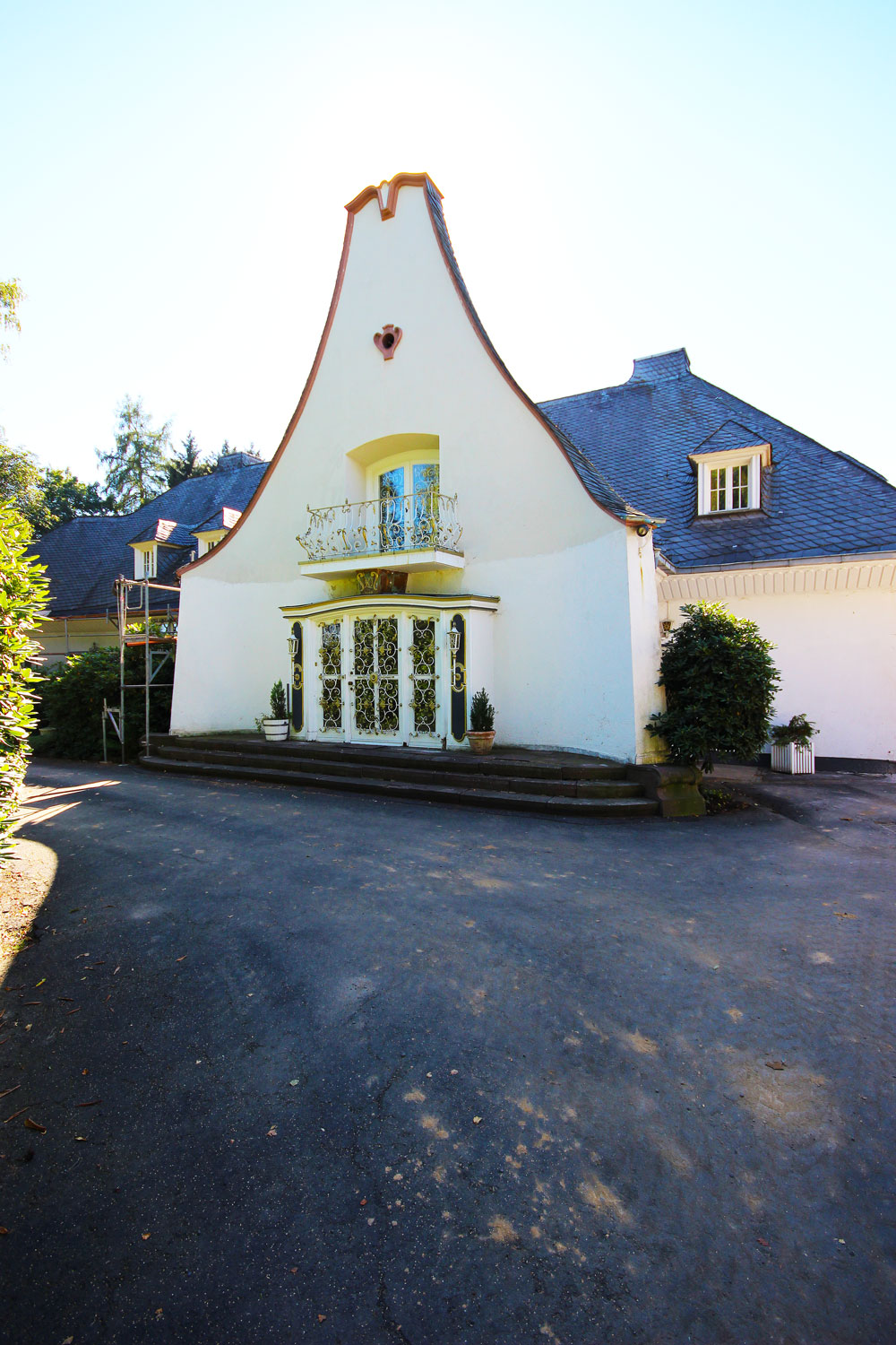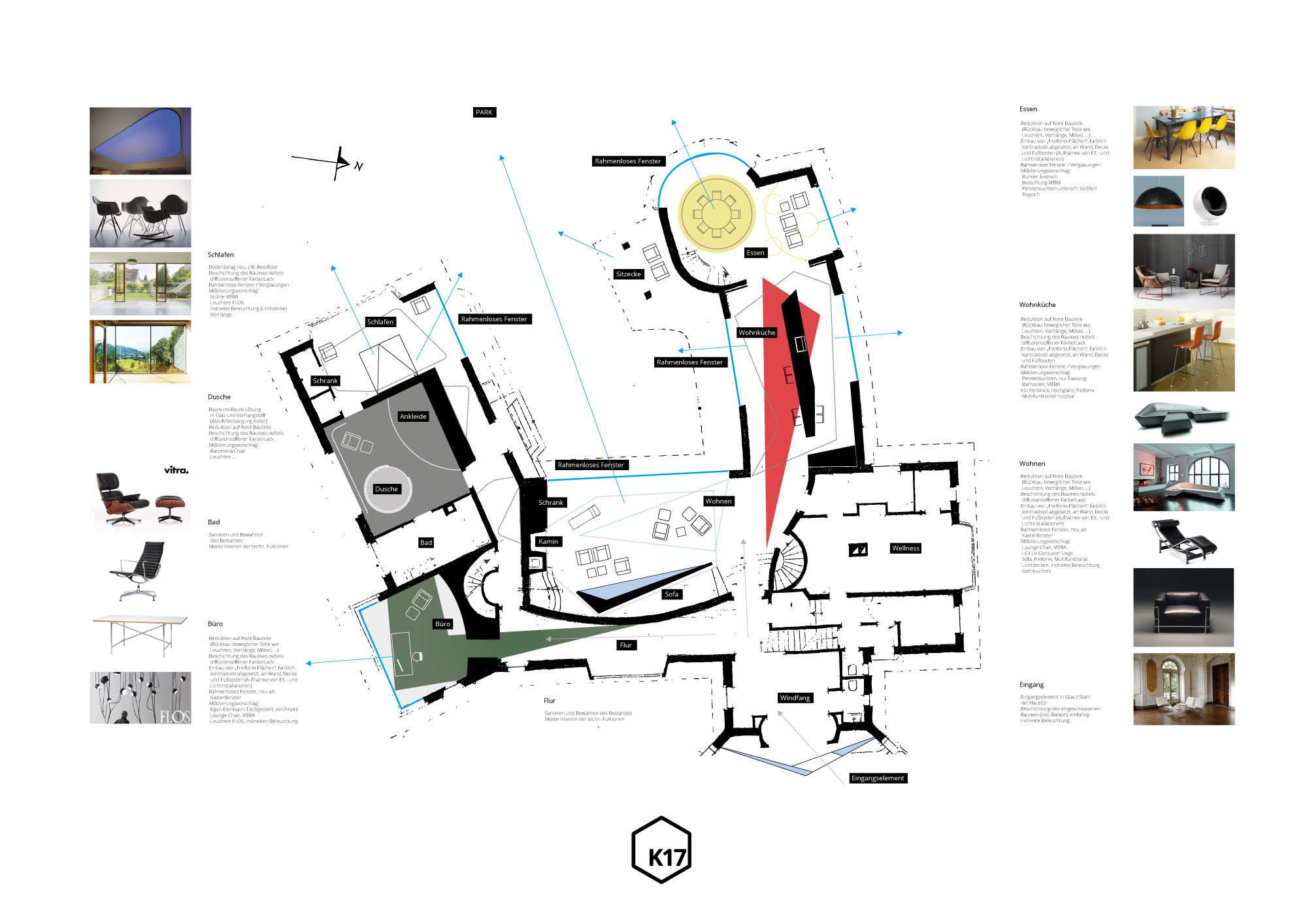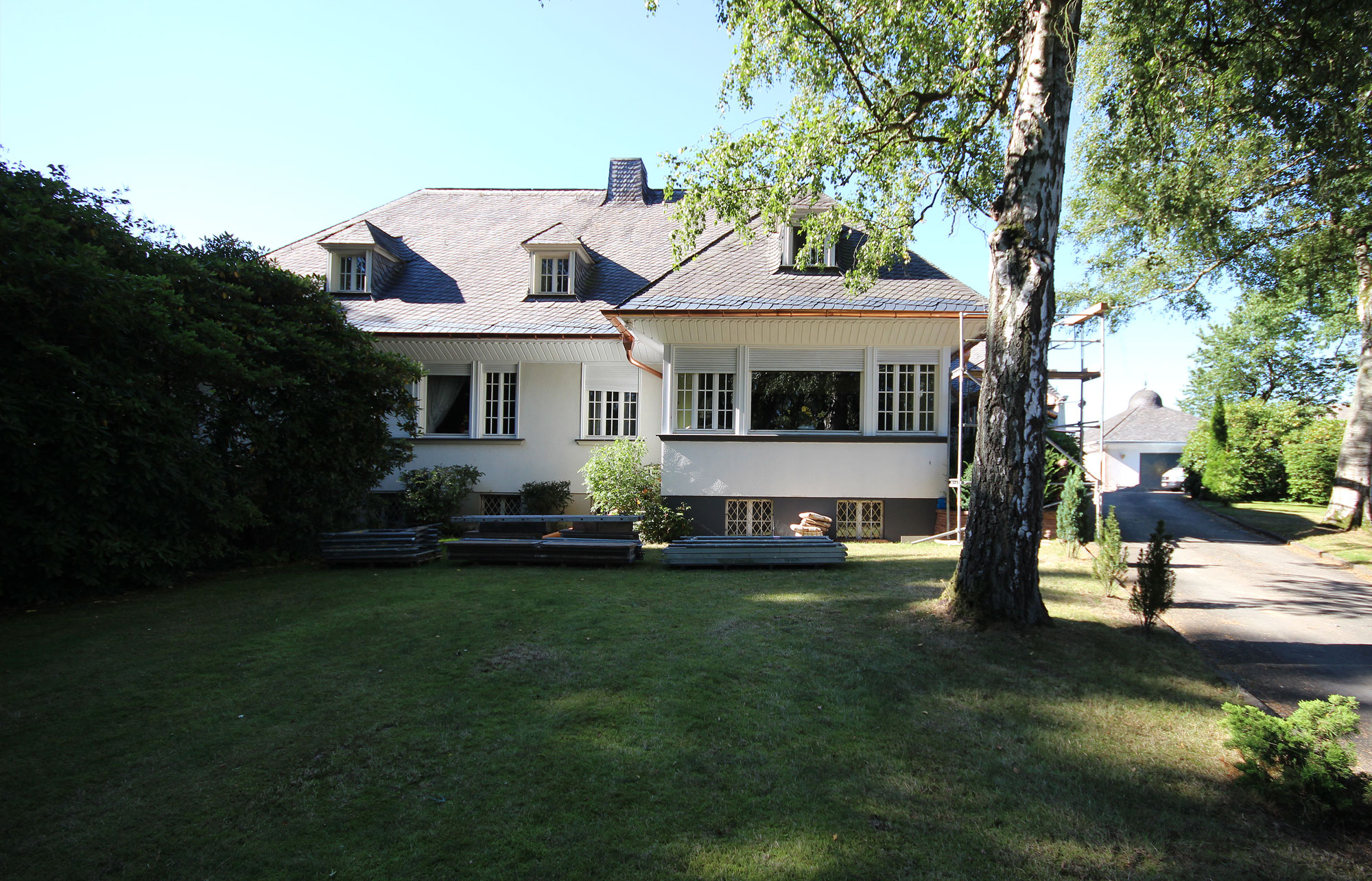 Besonderer Wert wurde auf die Verbindung zur großzügigen umliegenden Parkanlage gelegt. Blickachsen und räumliche Beziehungen zwischen Innen- und Außenbereichen wurden gezielt betont und neu inszeniert. Der Einbau großflächiger Fensterelemente schafft eine lichtdurchflutete Atmosphäre und ermöglicht einen fließenden Übergang zwischen Wohnraum und Natur.