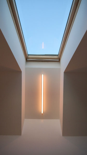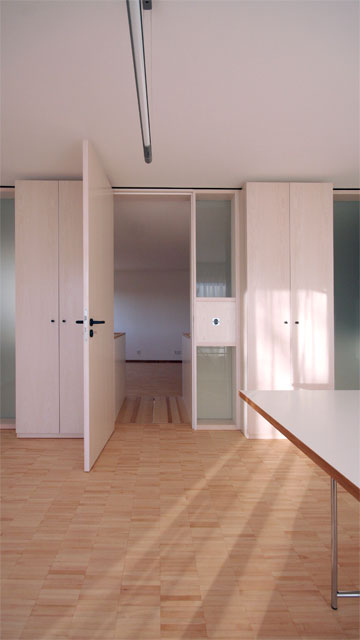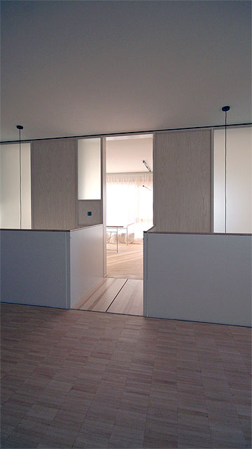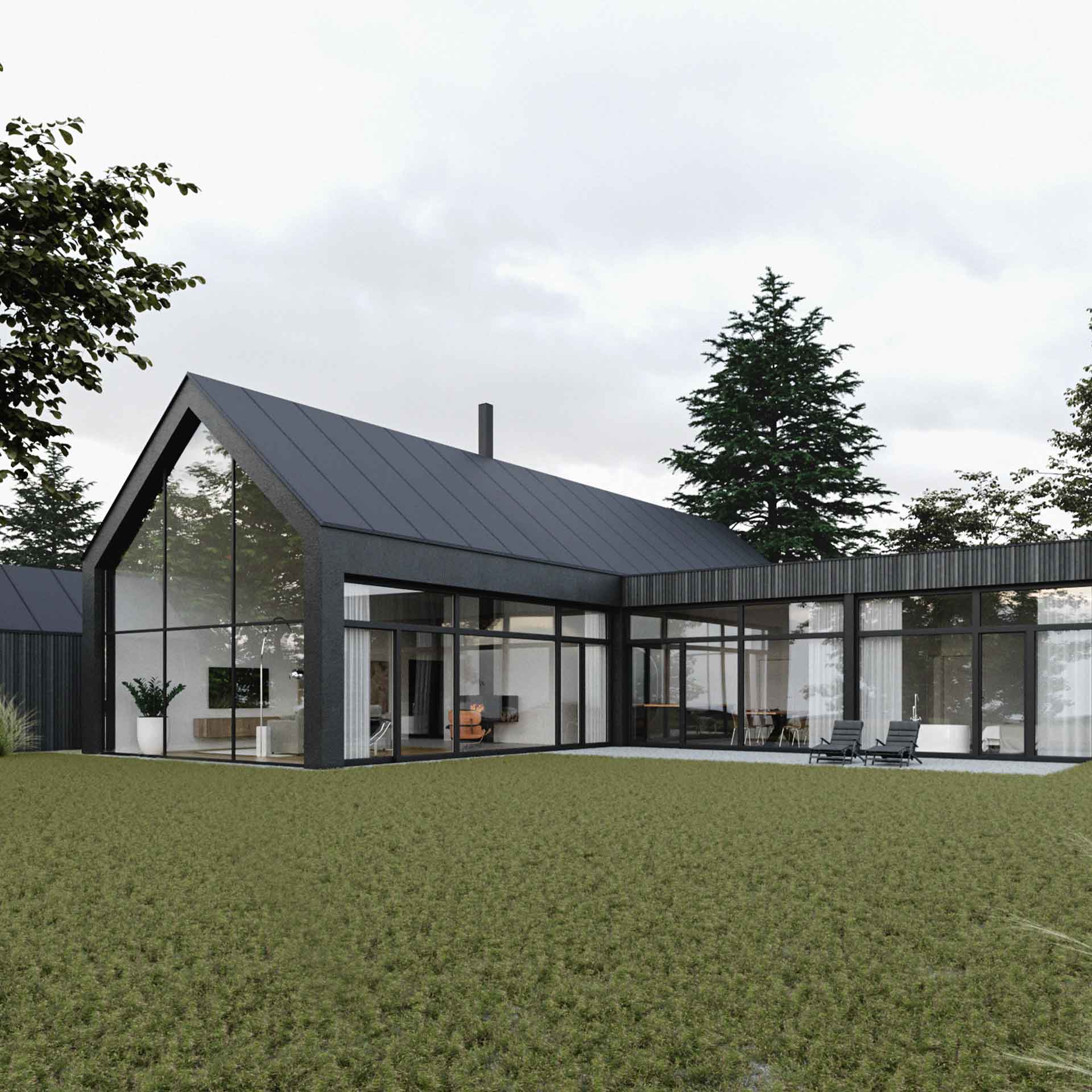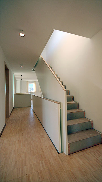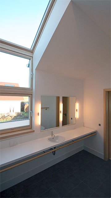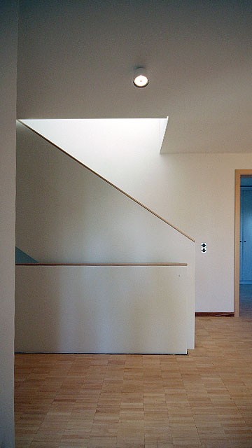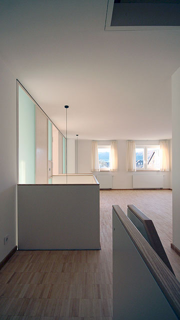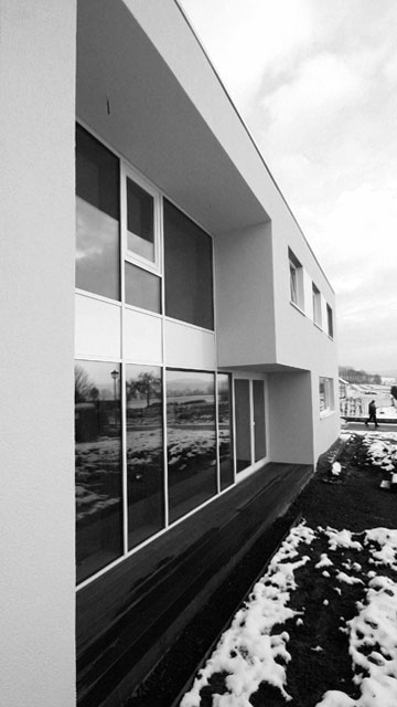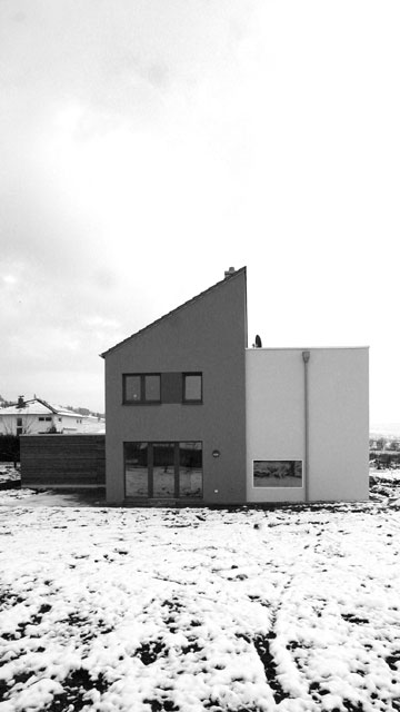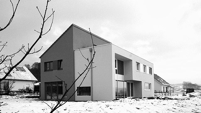 Inmitten der winterlichen "grauen" Jahreszeit wurde das Einfamilienhaus mit Doppelgarage fertiggestellt. Das Wohnhaus beherbergt helle Räume mit natürlichen und ökologischen Baumaterialien. Ein Steg bildet den Zugang zu einem lichtdurchfluteten Büro. Die Pfosten-Riegel-Glasfassade aus Holz/Aluminium sorgt für eine maximale natürliche Ausleuchtung. Das Garagentor wurde in die Lärchenholzfassade integriert.