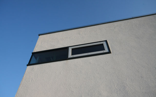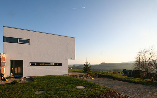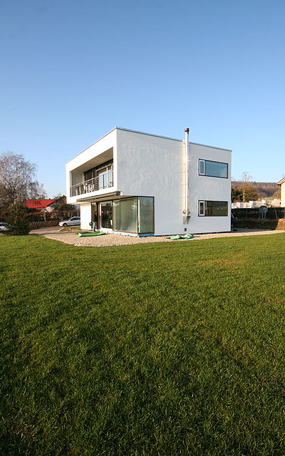 Ein besonderes Merkmal des Einfamilienhauses ist der lang auskragende Balkon. Der zwei- geschossige Massivbau ohne Unterkellerung ist auf einem leichten Hanggrundstück gele- gen. Wohn- und Essbereich bilden einen zentralen offenen Bereich im Erdgeschoss. Eine einläufige Treppe, umfasst von einer Wand- scheibe aus Sichtbeton, führt in das Ober- geschoss, indem sich Schlafräume, Kinderzimmer und Spielgalerie befinden. Erdgeschossig grenzt, direkt an das Wohnhaus, die Doppelgarage, in der Technik- und Geräteraum untergebracht sind.