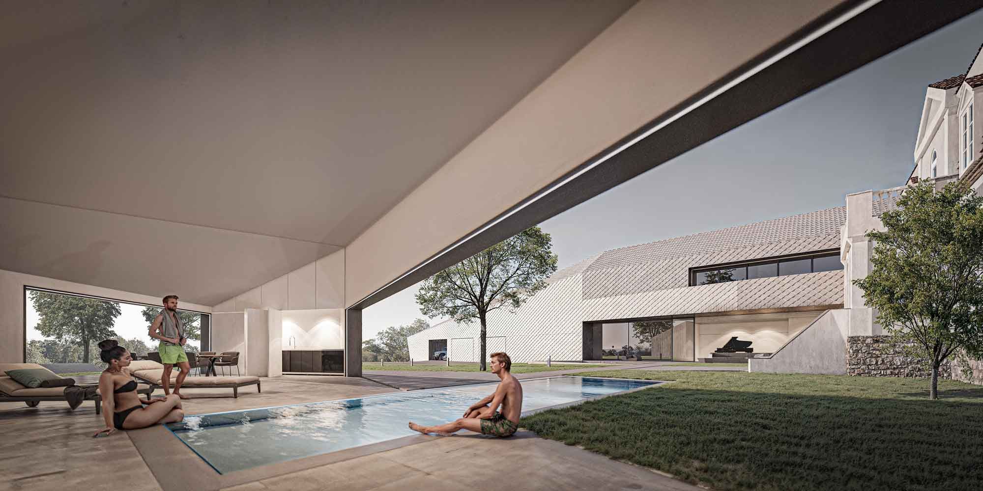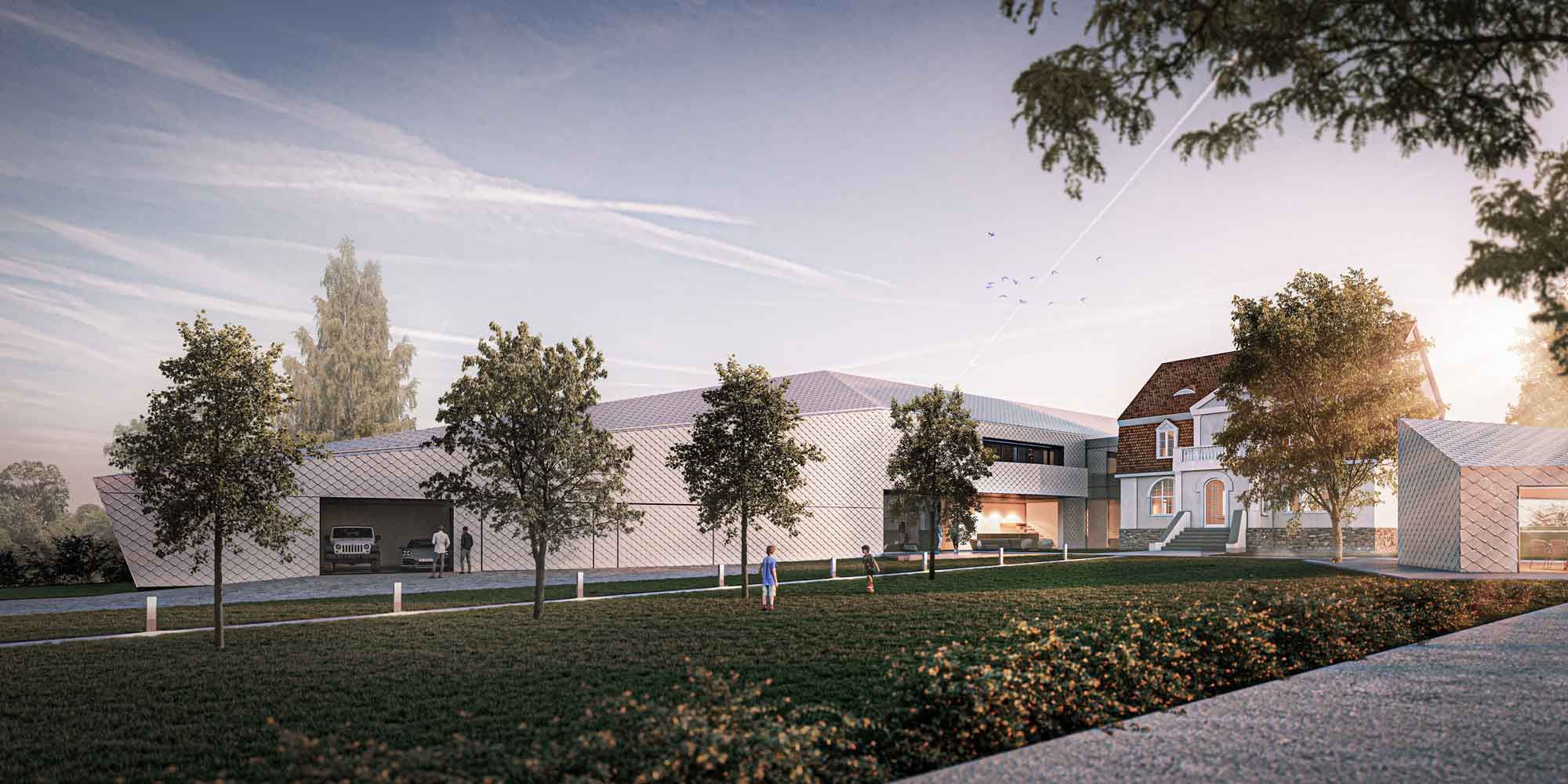 Auf einem großzügigen Grundstück entsteht ein barrierefreier Erweiterungsbau an ein bestehendes Wohnhaus. Die Architektur kombiniert moderne Formensprache mit polygonalen Dachflächen und setzt sich bewusst vom wertvollen historischen Bestand ab.