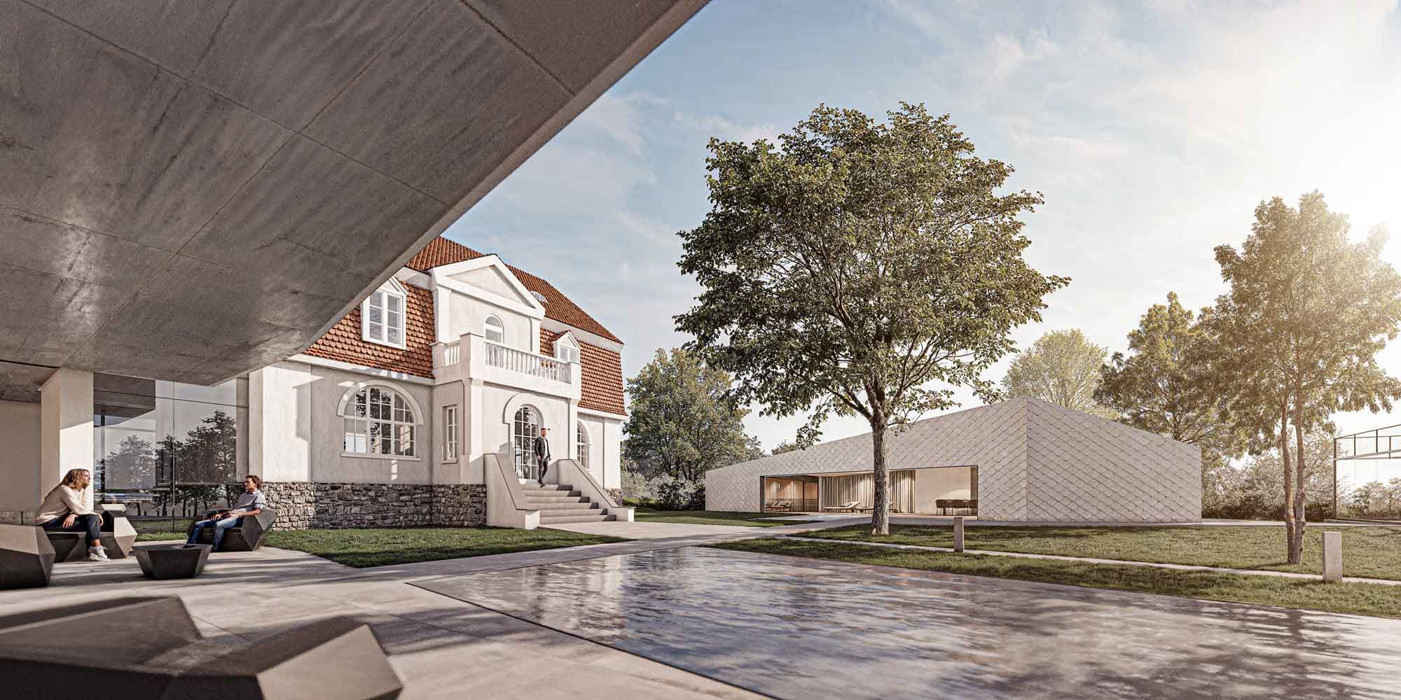 Ein Aufzug ermöglicht die barrierefreie Erschließung des Bestands und macht das gesamte Ensemble zukunftsfähig für mehrere Generationen. Die zentrale Zufahrt mündet in den Innenhof, der von den Gebäuden umschlossen ist. Dabei wurden die gewachsenen Strukturen des Grundstücks respektiert – Bestandsbäume wurden in die Planung integriert.