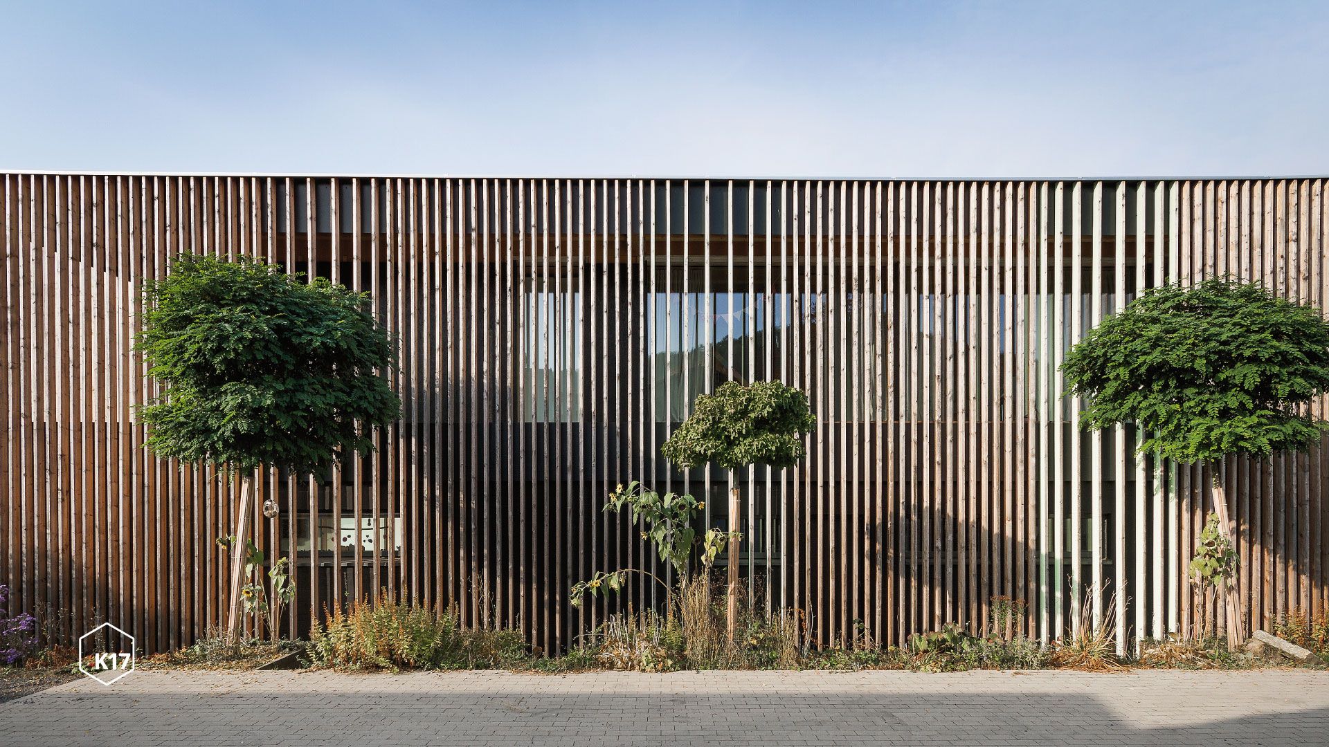 Ein zentrales Atrium bringt Licht in die inneren Räume, während raumhohe Verglasungen im Obergeschoss für eine offene, lichtdurchflutete Atmosphäre sorgen. Die offene Lärchenholzfassade verbindet die Geschosse und integriert einen geschützten Laubengang im Obergeschoss des Passivhauses. Zudem fungiert sie als natürlicher Sonnenschutz.